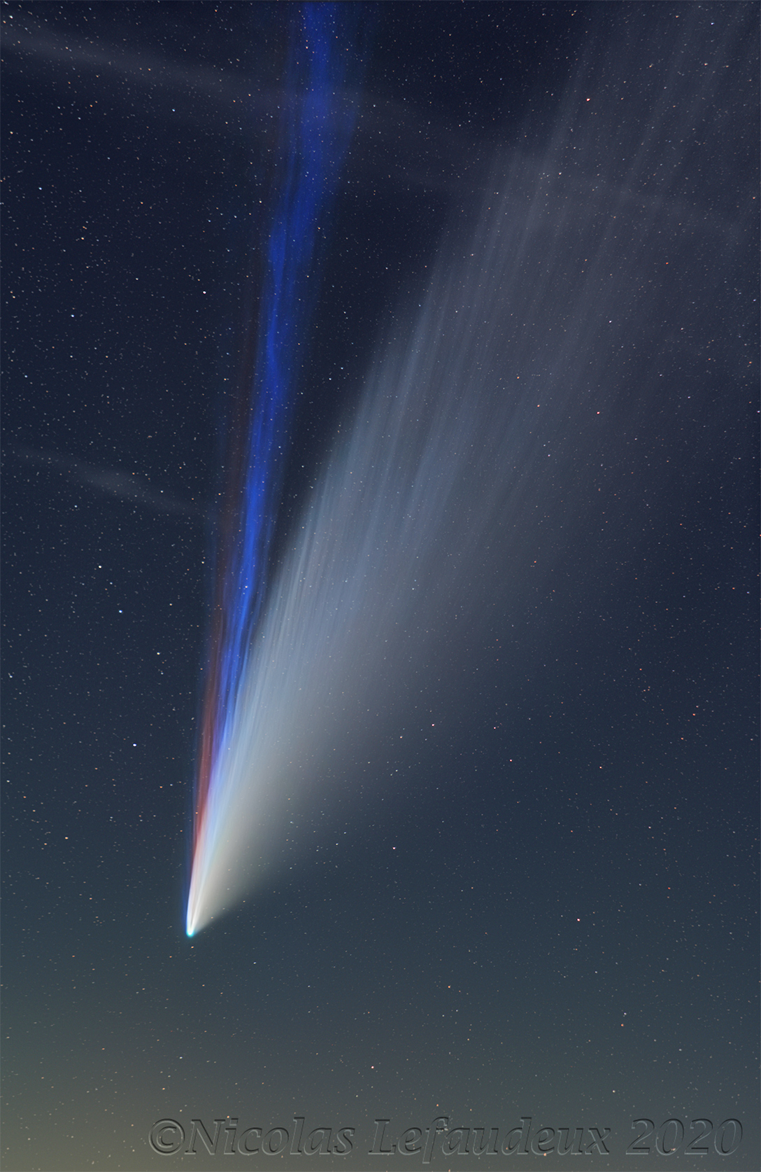 What created the unusual red tail in Comet NEOWISE? Sodium. A spectacular sight back in the summer of 2020, Comet NEOWISE, at times, displayed something more than just a surprisingly striated white dust tail and a pleasingly patchy blue ion tail. Some color sensitive images showed an unusual red tail, and analysis showed much of this third tail's color was emitted by sodium. Gas rich in sodium atoms might have been liberated from Comet NEOWISE's warming nucleus in early July by bright sunlight, electrically charged by ultraviolet sunlight, and then pushed out by the solar wind. The featured image was captured in mid-July from Brittany, France and shows the real colors. Sodium comet tails have been seen before but are rare -- this one disappeared by late July. Comet C/2020 F3 (NEOWISE) has since faded, lost all of its bright tails, and now approaches the orbit of Jupiter as it heads back to the outer Solar System, to return only in about 7,000 years. Astrophysicists: Browse 2,400+ codes in the Astrophysics Source Code Library