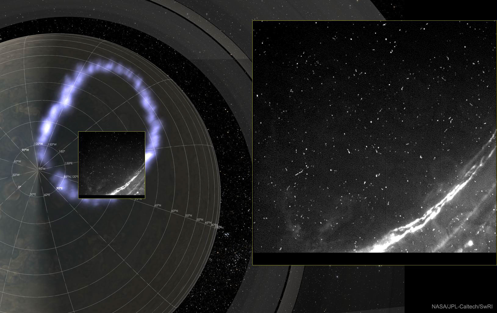 Why does so much of Jupiter's lightning occur near its poles? Similar to Earth, Jupiter experiences both aurorae and lightning. Different from Earth, though, Jupiter's lightning usually occurs near its poles -- while much of Earth's lightning occurs near its equator. To help understand the difference, NASA's Juno spacecraft, currently orbiting Jupiter, has observed numerous aurora and lightning events. The featured image, taken by Juno's Stellar Reference Unit camera on 2018 May 24, shows Jupiter's northern auroral oval and several bright dots and streaks. An eye-catching event is shown in the right inset image -- which is a flash of Jupiter's lightning -- one of the closest images of aurora and lightning ever. On Earth (which is much nearer to the Sun than Jupiter), sunlight is bright enough to create, by itself, much stronger atmospheric heating at the equator than the poles, driving turbulence, storms, and lightning. On Jupiter, in contrast, atmospheric heating comes mostly from its interior (as a remnant from its formation), leading to the hypothesis that more intense equatorial sunlight reduces temperature differences between upper atmospheric levels, hence reducing equatorial lightning-creating storms. APOD via Facebook in: in English, Catalan and Portuguese