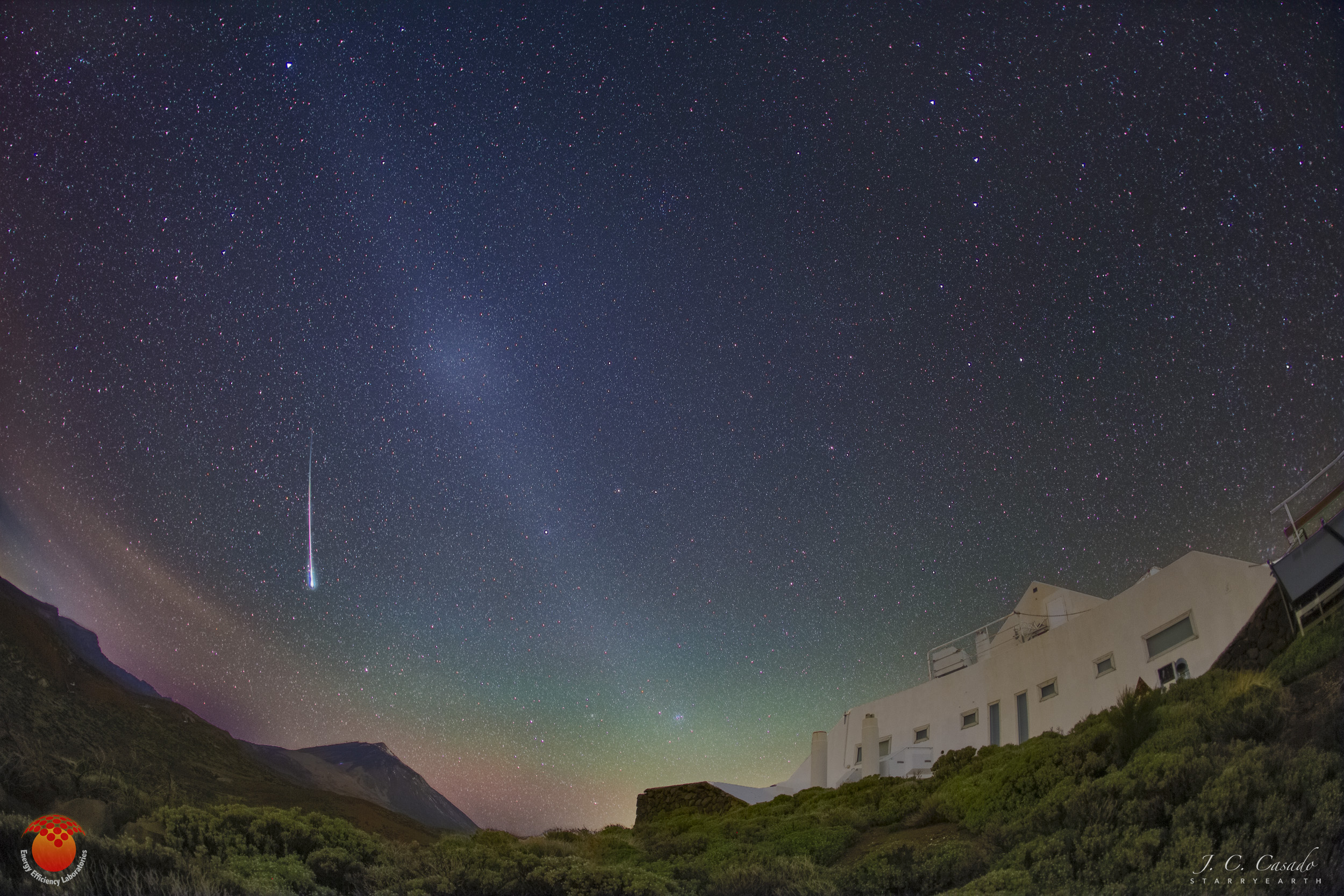 ¿Es el cielo nocturno más oscuro en la dirección opuesta al Sol? No. De hecho, un brillo tenue y raramente discernible conocido como gegenschein (en alemán, 'counter glow' o 'brillo contraste') puede verse a 180 grados del Sol en un cielo extremadamente oscuro. El gegenschein es la luz solar retrodispersada por partículas pequeñas de polvo interplanetario. Estas partículas de polvo son fragmentos milimétricos de asteroides y orbitan en el plano de la eclíptica de los planetas. La imagen, tomada en marzo pasado, es una de las más espectaculares jamás captadas del gegenschein. La exposición profunda de un cielo extremadamente oscuro sobre el Observatorio del Teide en las Islas Canarias de España muestra el gegenschein como parte de la luz zodiacal extendida. Entre los objetos notables en el fondo se encuentran un meteorito brillante (a la izquierda), la Osa Mayor (arriba a la derecha) y la Estrella Polar (muy a la derecha). El meteorito casi apunta hacia el Monte Teide, la montaña más alta de España, mientras que el laboratorio solar de la Pirámide es visible a la derecha. Durante el día, un fenómeno similar al gegenschein llamado gloria puede verse en el aire o en nubes reflejantes opuestas al Sol desde un avión.