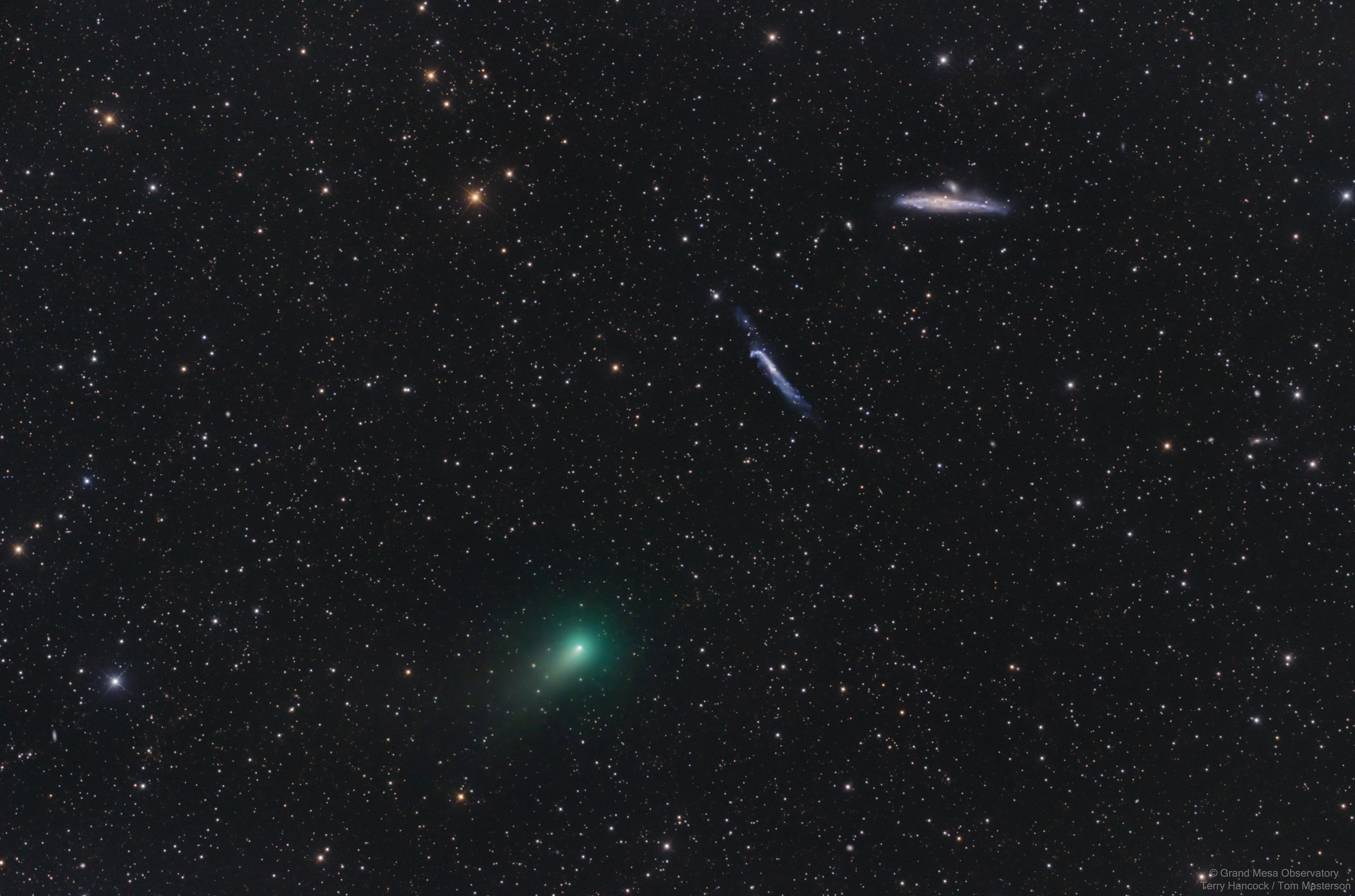 En su punto más cercano al Sol el 1 de marzo, y en su punto más cercano a la Tierra el 23 de abril, este cometa ATLAS (C/2020 R4) muestra una débil coma de color verde y una corta cola en esta hermosa imagen obtenida con telescopio. Capturado en su posición del 5 de mayo, el cometa se encontraba dentro de los límites de la constelación norteña de Canes Venatici (los Perros de Caza), y cerca de la línea de visión hacia galaxias de fondo interesantes conocidas popularmente como la Ballena y el Palo de Hockey. Aunque tiene apariencia cetácea, NGC 4631 es una galaxia espiral vista de perfil en la parte superior derecha, a unos 25 millones de años luz de distancia. NGC 4656/7 muestra la forma curvada de galaxias en interacción, ubicadas debajo y a la izquierda de NGC 4631. De hecho, las distorsiones y las colas entrelazadas de gas detectadas en otras longitudes de onda sugieren que la ballena cósmica y el palo de hockey han tenido encuentros cercanos entre sí en el pasado lejano. En su trayectoria de salida y a unos 7 minutos luz de la Tierra, este cometa ATLAS regresará al sistema solar interior en menos de 1000 años.