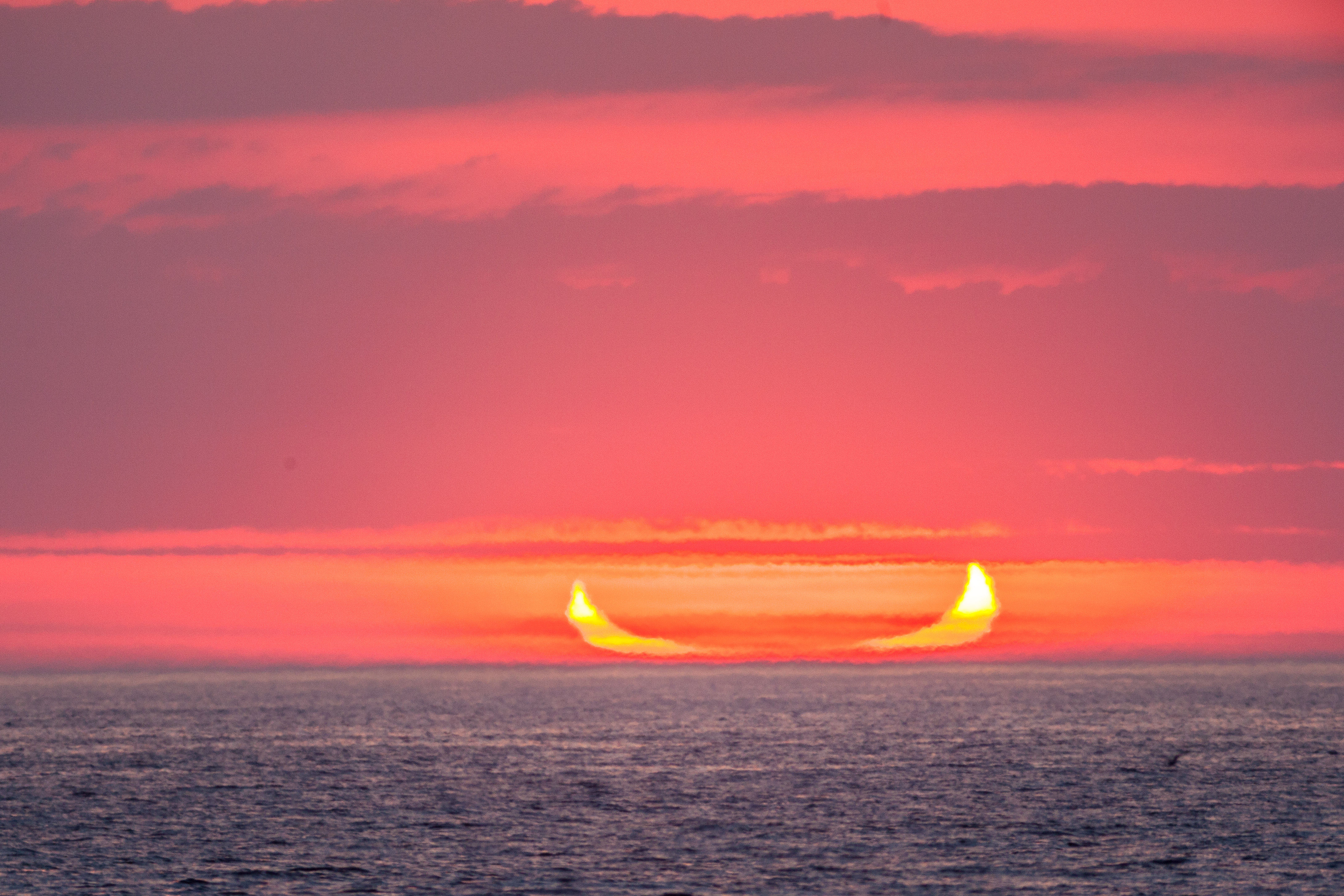 La refracción atmosférica aplanó el disco solar y distorsionó su apariencia en esta vista telescópica del amanecer en el Atlántico del 10 de junio. La escena fue registrada desde Belmar, Nueva Jersey, en la costa este de Estados Unidos, durante la Luna Nueva de esta temporada, durante un eclipse solar anular. La Luna en silueta parcial le da al Sol naciente su forma de cuerno, recordando a algunos los cuernos del diablo (o quizás una canoa voladora...). Pero en su fase anular completa, el Sol eclipsado lució como un anillo de fuego en el cielo. El eclipse solar anular de junio siguió de cerca al eclipse lunar total de la Luna Llena de finales de mayo. Por supuesto, ese eclipse lunar total fue un dramático eclipse de Luna de Sangre rojiza.