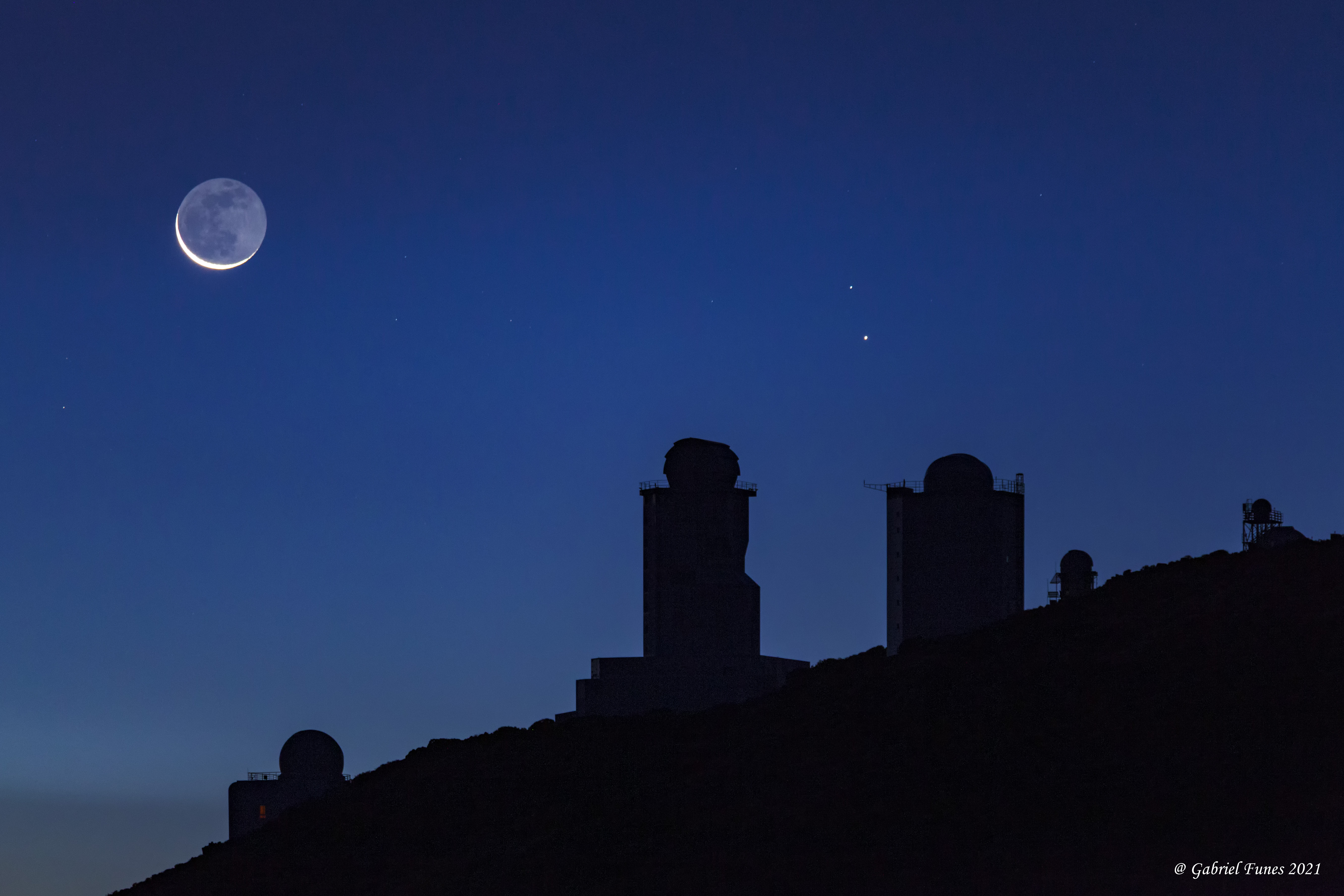 El 8 de julio, los observadores tempraneros vieron a Mercurio cerca de una Luna vieja baja en el horizonte oriental. En esa fecha, el planeta brillante, el tenue resplandor del lado nocturno lunar y el creciente iluminado por el Sol fueron capturados en esta escena del cielo antes del amanecer en el Parque Nacional del Teide en las Islas Canarias. Lejos del Sol en el cielo de la Tierra, el planeta interior efímero brilla cerca de su máxima brillantez en la escena de la aurora matutina. Mercurio se encuentra justo debajo de la estrella zeta de la constelación de Tauro, Zeta Tauri, cerca de la punta del cuerno del toro celestial. Por supuesto, el resplandor ceniciento de la Luna es el brillo terrestre, la luz de la Tierra reflejada en el lado nocturno de la Luna. Una descripción del brillo terrestre, en términos de luz solar reflejada por los océanos de la Tierra iluminando la superficie oscura de la Luna, fue escrita hace más de 500 años por Leonardo da Vinci. En primer plano, esperando el amanecer que se avecina, están los centinelas del Sol del Observatorio del Teide, también conocidos como (domos grandes de izquierda a derecha) los telescopios solares THEMIS, VTT y GREGOR.
