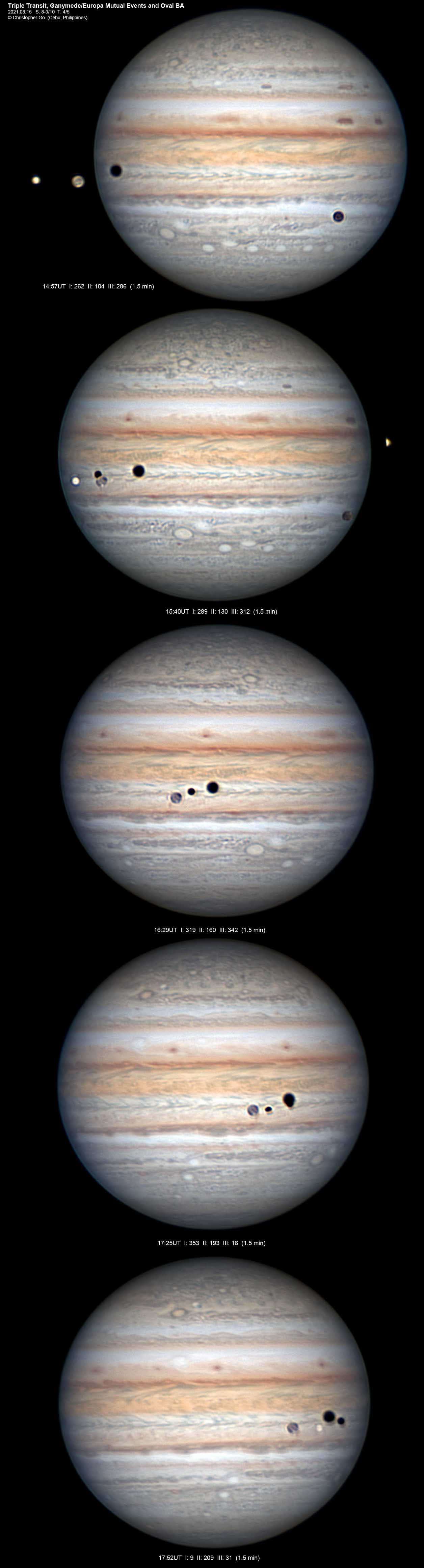 Estos tres paneles muestran al gigante gaseoso Júpiter, rey del Sistema Solar, el 15 de agosto, tal como se ve desde la ciudad de Cebú, Filipinas, en la Tierra. En esa fecha, las vistas telescópicas bien temporizadas detallan algunas actuaciones notables, tránsitos y eventos mutuos, por parte de las lunas galileanas de Júpiter. En el panel superior, Io está a punto de desaparecer en la sombra de Júpiter en la parte superior derecha, pero las otras tres grandes lunas jovianas aparecen sobre el disco a rayas del planeta. Europa, más brillante, y Ganímedes, más oscuro, están en la parte superior izquierda, también proyectando sus dos sombras sobre las nubes del gigante gaseoso. Calisto está debajo y cerca del borde del planeta, las tres lunas en un tránsito triple sobre la cara de Júpiter. Al pasar al panel central, las sombras de Europa y Ganímedes siguen visibles cerca del centro, pero Ganímedes ha ocultado o pasado frente a Europa. El panel inferior captura una vista rara de las lunas jovianas en eclipse mientras transitan por Júpiter, con la sombra de Ganímedes cayendo directamente sobre Europa. Desde la perspectiva de la Tierra, eventos similares, en los que las lunas galileanas se ocultan y eclipsan entre sí, pueden observarse cada seis años aproximadamente, cuando Júpiter se encuentra cerca de su propio equinoccio.