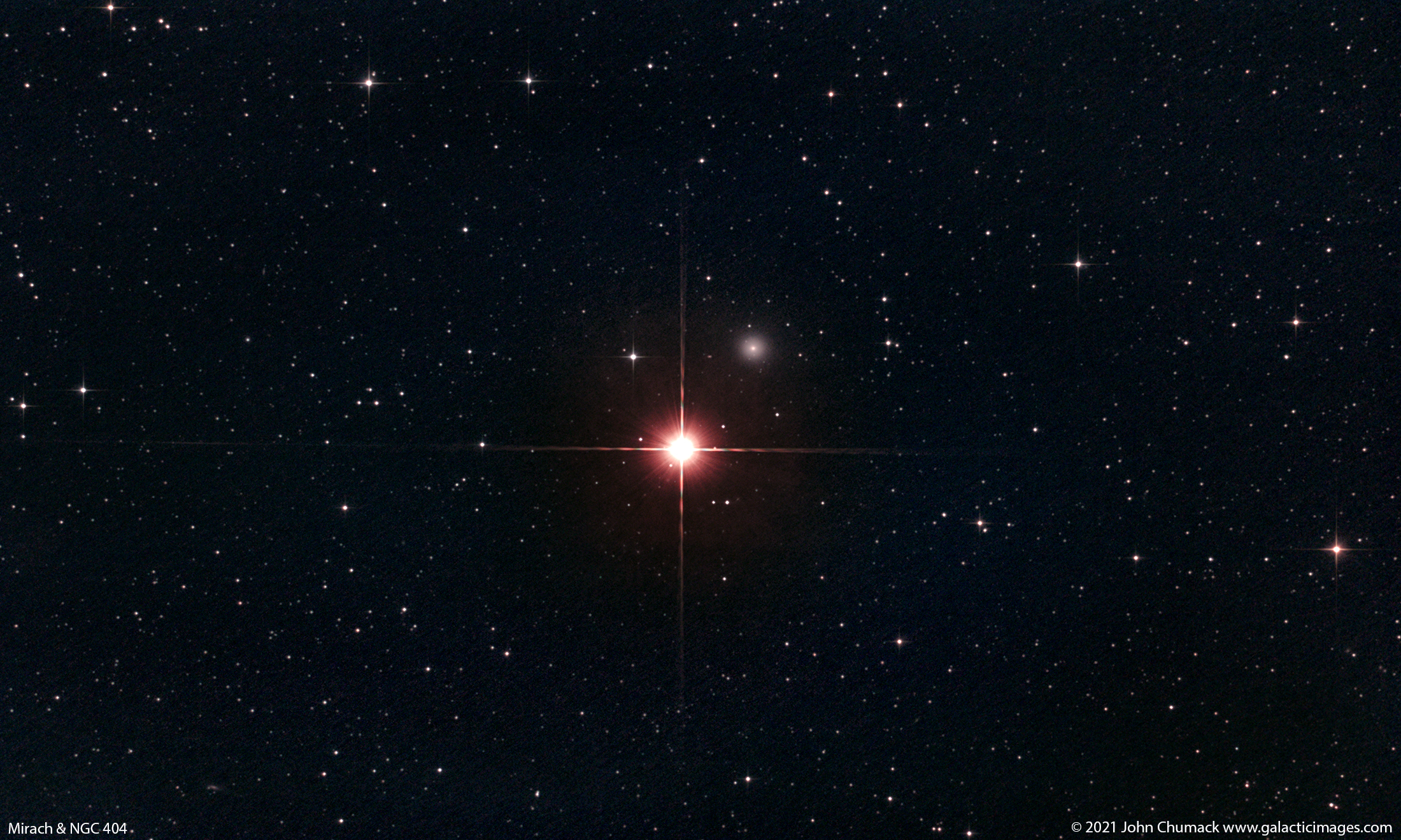 En cuanto a fantasmas, El Fantasma de Mirach no es realmente tan aterrador. El Fantasma de Mirach es simplemente una galaxia tenue y borrosa, bien conocida por los astrónomos, que por casualidad se encuentra casi alineada con la línea de visión hacia Mirach, una estrella brillante. Centrada en este campo estelar, Mirach también se llama Beta Andromedae. A unos 200 años luz de distancia, Mirach es una estrella gigante roja, más fría que el Sol pero mucho más grande y, por lo tanto, intrínsecamente mucho más brillante que nuestra estrella madre. En la mayoría de las imágenes obtenidas con telescopios, el resplandor y las espinas de difracción tienden a ocultar los objetos cercanos a Mirach y hacen que la galaxia tenue y borrosa parezca una reflexión fantasmal de la luz estelar casi abrumadora. Sin embargo, en esta imagen nítida, El Fantasma de Mirach aparece justo encima y a la derecha de Mirach, y está catalogado como la galaxia NGC 404, cuya distancia estimada es de unos 10 millones de años luz.