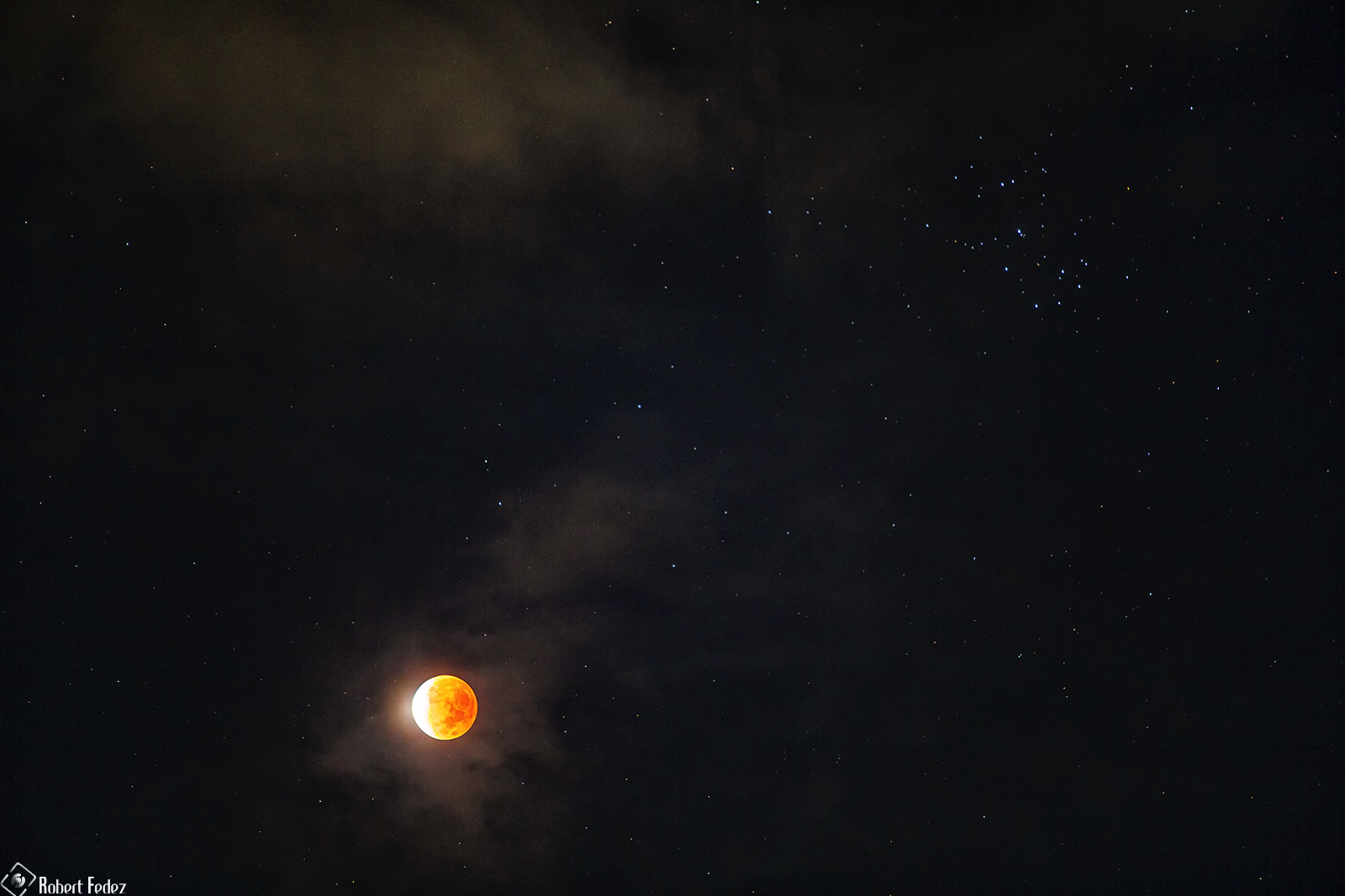 Predawn hours of November 19 found the Moon in partly cloudy skies over Cancun, Mexico. Captured in this telephoto snapshot, the lunar disk is not quite entirely immersed in Earth's dark umbral shadow during a long partial lunar eclipse. The partial eclipse was deep though, deep enough to show the dimmed but reddened light in Earth's shadow. That's a sight often anticipated by fans of total lunar eclipses. Wandering through the constellation Taurus, the eclipsed Moon's dimmer light also made it easier to spot the Pleiades star cluster. The stars of the Seven Sisters share this frame at the upper right, with the almost totally eclipsed Moon. Notable APOD Submissions (so far): Lunar Eclipse of 2021 November 19