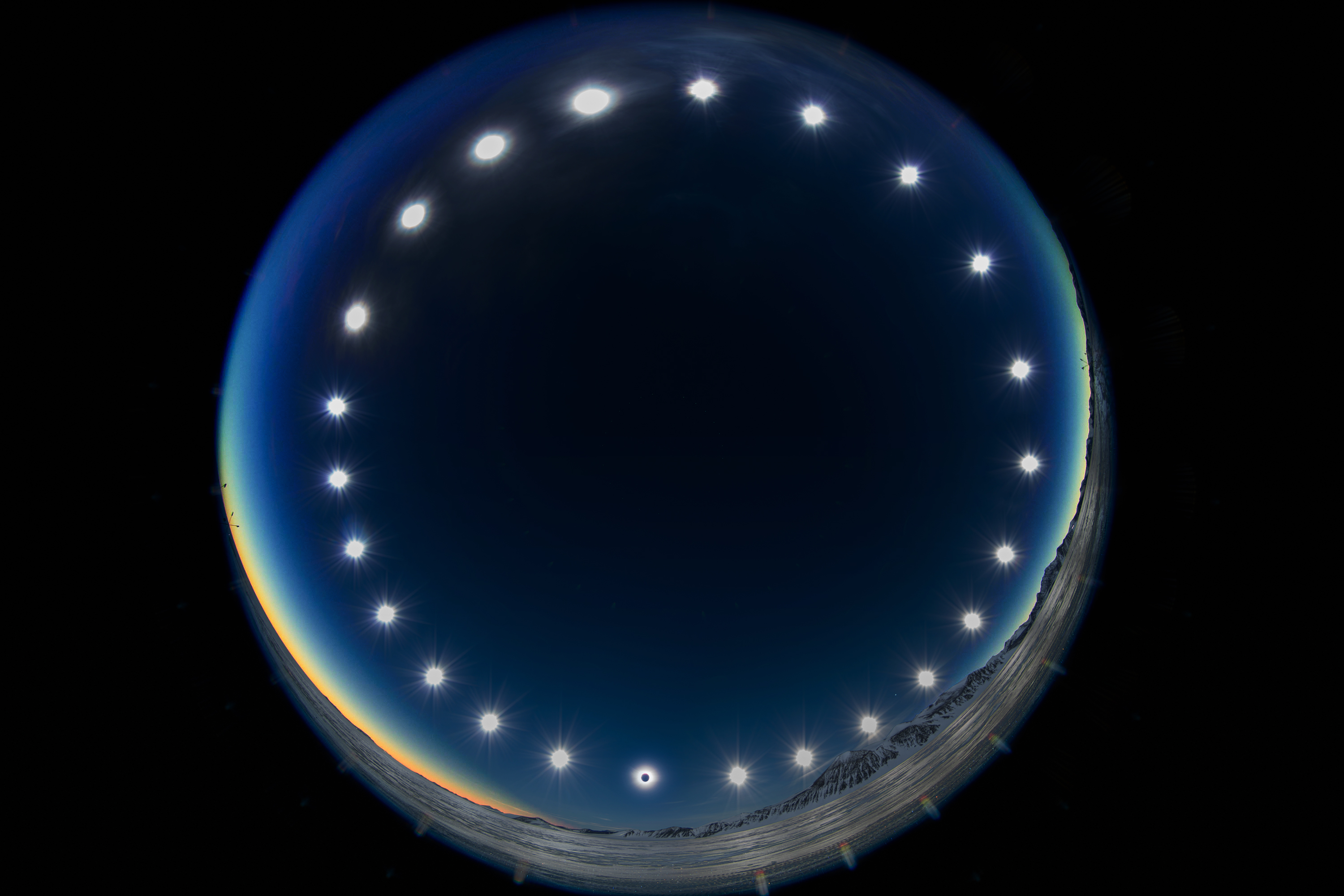 Durante el día polar, en el verano ártico y antártico, el Sol permanece por encima del horizonte durante períodos de 24 horas o más. Esta imagen en movimiento de tipo fisheye, grabada el 4 de diciembre, sigue al Sol en múltiples fotogramas mientras completa un círculo en el cielo de verano sobre la Unión Glaciar, en la Antártida. Por supuesto, en esa fecha, el cielo sobre la Unión Glaciar sí se oscureció, aunque el Sol estuviera por encima del horizonte. Capturado durante el breve período de totalidad, un Sol eclipsado se encuentra en el centro inferior de la vista compuesta. Cerca del borde del camino de eclipse total sobre la Tierra, la sombra de la Luna oscurece el cielo sobre la región.