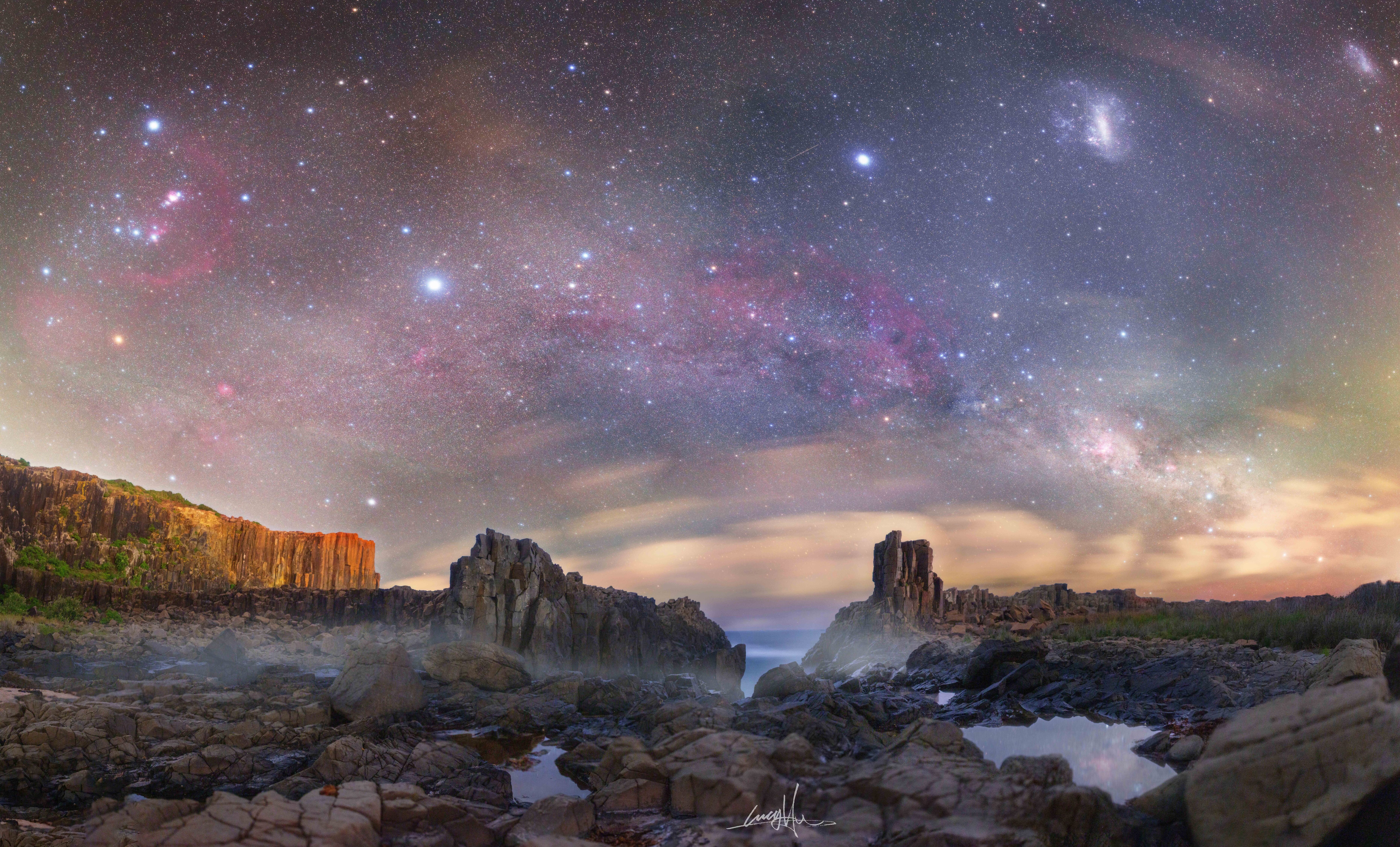 Este es un cielo lleno de iconos luminosos. A la extrema izquierda se encuentra la familiar constelación de Orión, dividida por sus tres estrellas alineadas de la cintura y que incluye la famosa Nebulosa de Orión, ambas parcialmente rodeadas por el Bucle de Barnard. Justo a la izquierda del centro en la imagen destacada se encuentra la estrella más brillante de la noche: Sirio. Atravesando el centro de la imagen se extiende la banda central de nuestra Galaxia Vía Láctea. En la extrema derecha, cerca de la parte superior, se encuentran las dos galaxias satélite más brillantes de la Vía Láctea: la Gran Nube de Magallanes (LMC, por sus siglas en inglés) y la Pequeña Nube de Magallanes (SMC, por sus siglas en inglés). También en la extrema derecha — justo por encima del horizonte nuboso — se encuentra la constelación de Crux, completa con las cuatro estrellas que forman la icónica Cruz del Sur. La imagen destacada es un compuesto de 18 exposiciones consecutivas tomadas por la misma cámara y desde el mismo lugar en el este de Australia durante los últimos días del año anterior. En primer plano, las columnas pictóricas de basalto de la cantera de Bombo se abren para revelar el vasto Océano Pacífico.