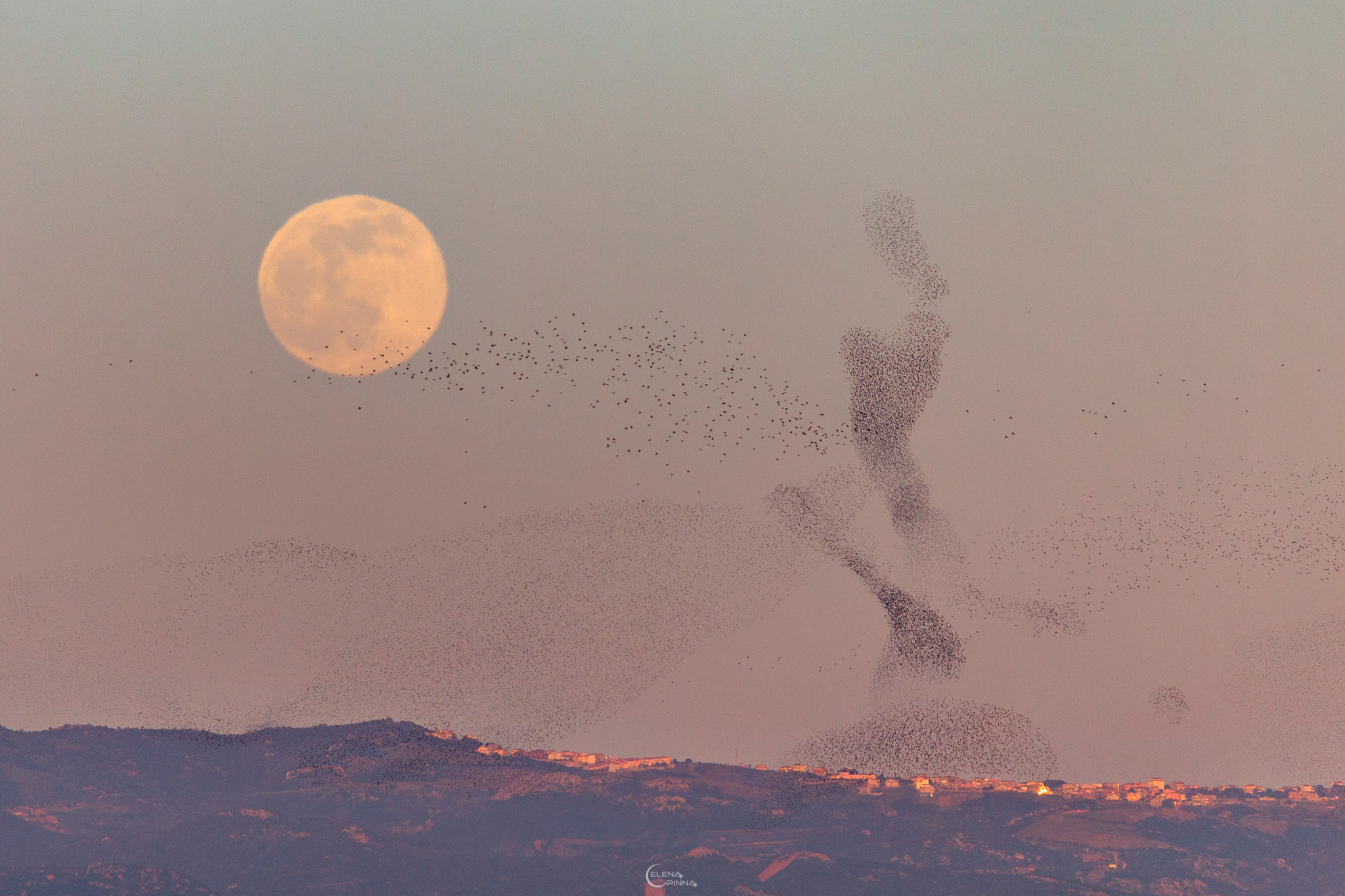 On Monday, January's Full Moon rose as the Sun set. Spotted near the eastern horizon, its warm hues are seen in this photo taken near Cagliari, capital city of the Italian island of Sardinia. Of course the familiar patterns of light and dark across the Moon's nearside are created by bright rugged highlands and dark smooth lunar maria. Traditionally the patterns are seen as pareidolia, giving the visual illusion of a human face like the Man in the Moon, or familiar animal like the Moon rabbit. But for a moment the swarming murmuration, also known as a flock of starlings, frozen in the snapshot's field of view lends another pareidolic element to the scene. Some see the graceful figure of a dancer enchanted by moonlight.