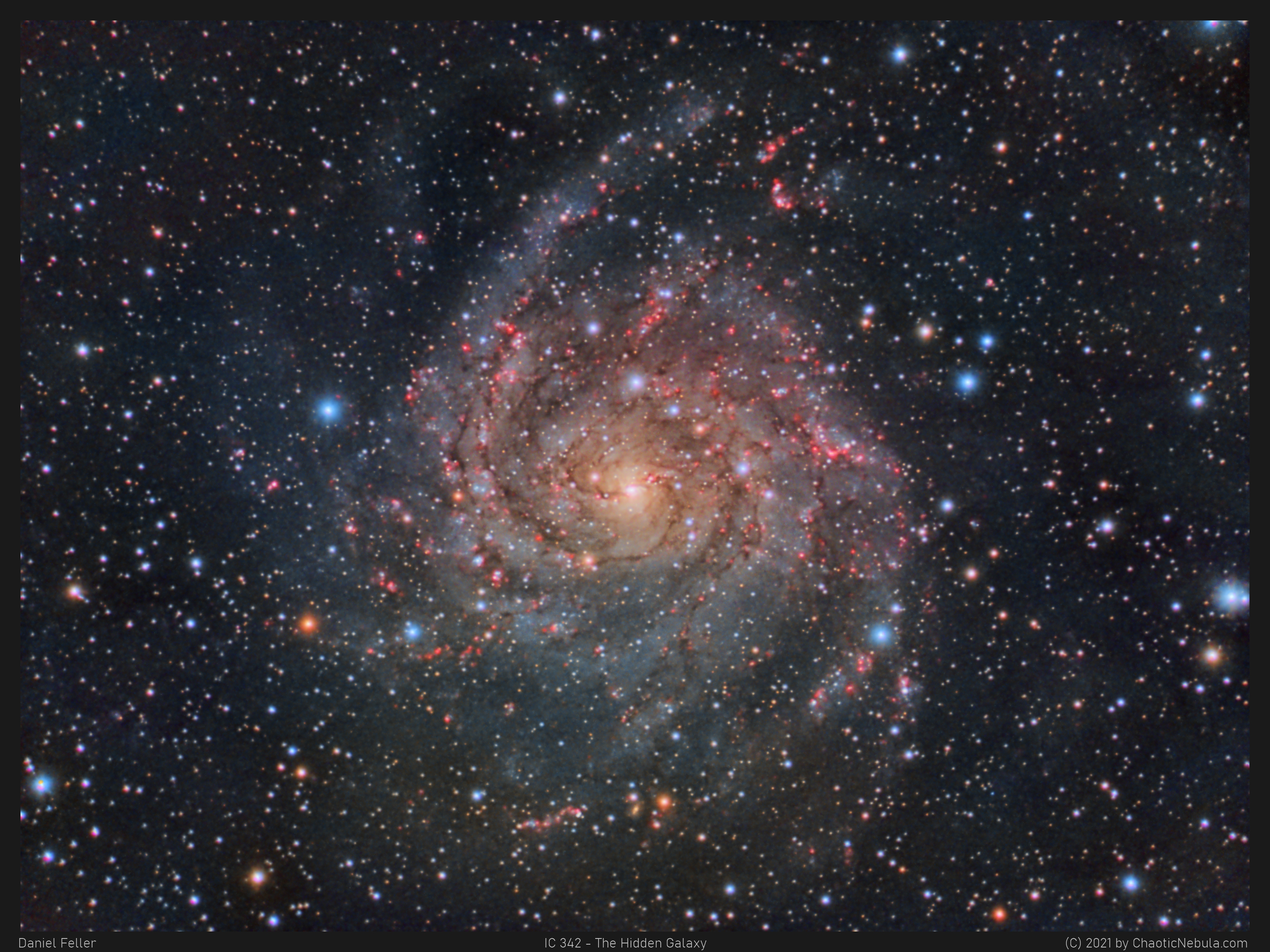 Similar en tamaño a grandes galaxias espirales brillantes de nuestra vecindad, IC 342 se encuentra a una distancia de apenas 10 millones de años luz en la constelación norteña de Camelopardalis, de cuello largo. Una isla universo extendida, IC 342 sería de otro modo una galaxia destacada en nuestro cielo nocturno, pero permanece oculta de una visión clara y solo se puede entrever a través del velo de estrellas, nubes de gas y polvo que se alinean a lo largo del plano de nuestra propia galaxia Vía Láctea. Aunque la luz de IC 342 se atenúa y enrojece debido a las nubes cósmicas intermedias, esta imagen telescópica nítida traza el polvo que oculta la galaxia, los jóvenes cúmulos estelares y las regiones rosadas que emiten luz al formar nuevas estrellas a lo largo de sus brazos espirales que se extienden lejos del núcleo galáctico. IC 342 podría haber experimentado una reciente explosión de actividad de formación estelar y está lo suficientemente cerca como para haber influido gravitacionalmente en la evolución del grupo local de galaxias y la Vía Láctea.