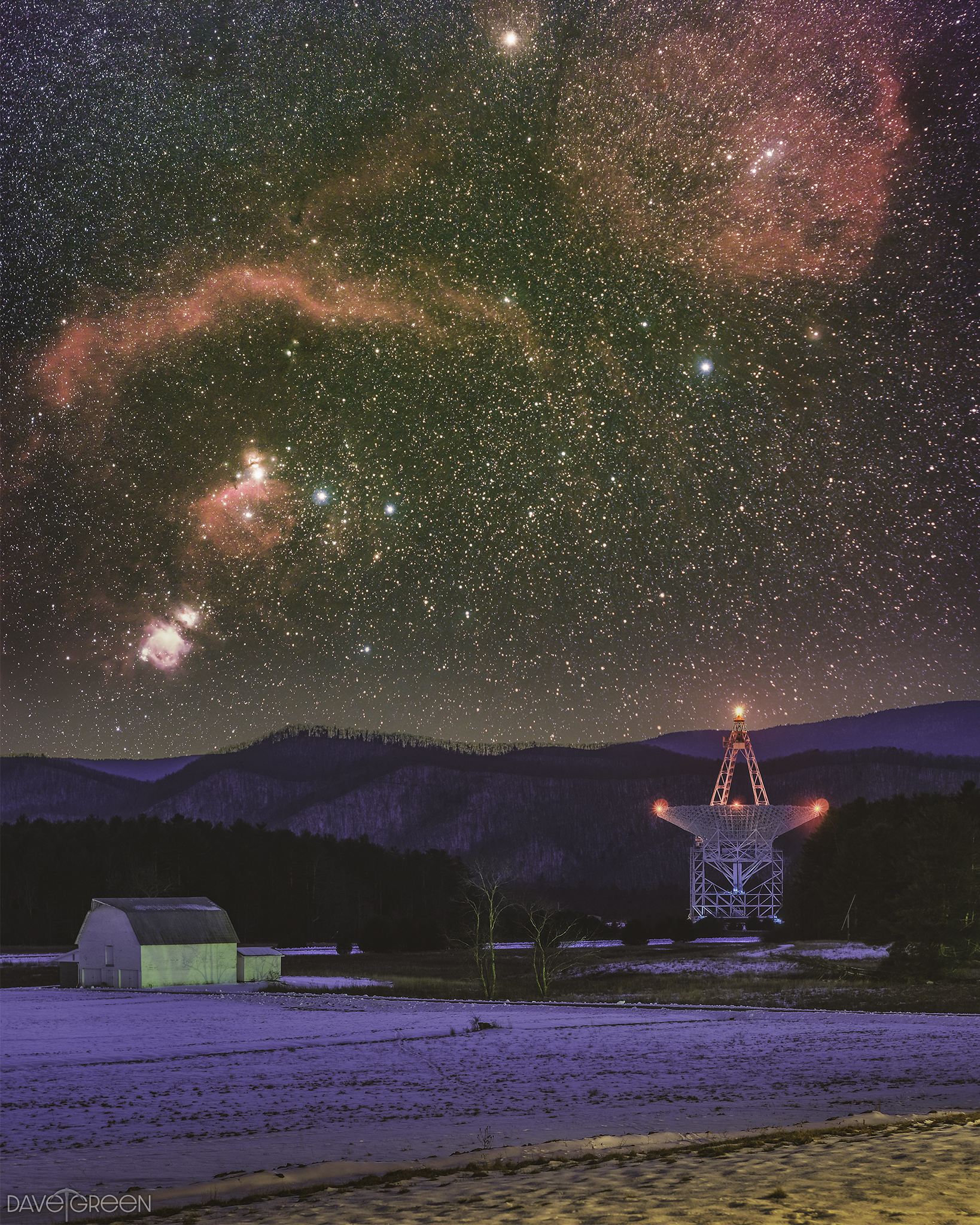What will the huge Green Bank Telescope discover tonight? Pictured, the Robert C. Byrd Green Bank Telescope (GBT) on the lower right is the largest fully-pointable single-dish radio telescope in the world. With a central dish larger than a football field, the GBT is nestled in the hills of West Virginia, USA in a radio quiet zone where the use of cell phones, WiFi emitters, and even microwave ovens are limited. The GBT explores our universe not only during the night -- but during the day, too, since the daytime sky is typically dark in radio waves. Taken in late January, the featured image was planned for months to get the setting location of Orion just right. The image is a composite of a foreground shot taken over a kilometer away from the GBT, and a background shot built up of long exposures during the previous night. The deep background image of Orion is fitting because the GBT is famous for, among many discoveries, mapping the unusual magnetic field in the Orion Molecular Cloud Complex.