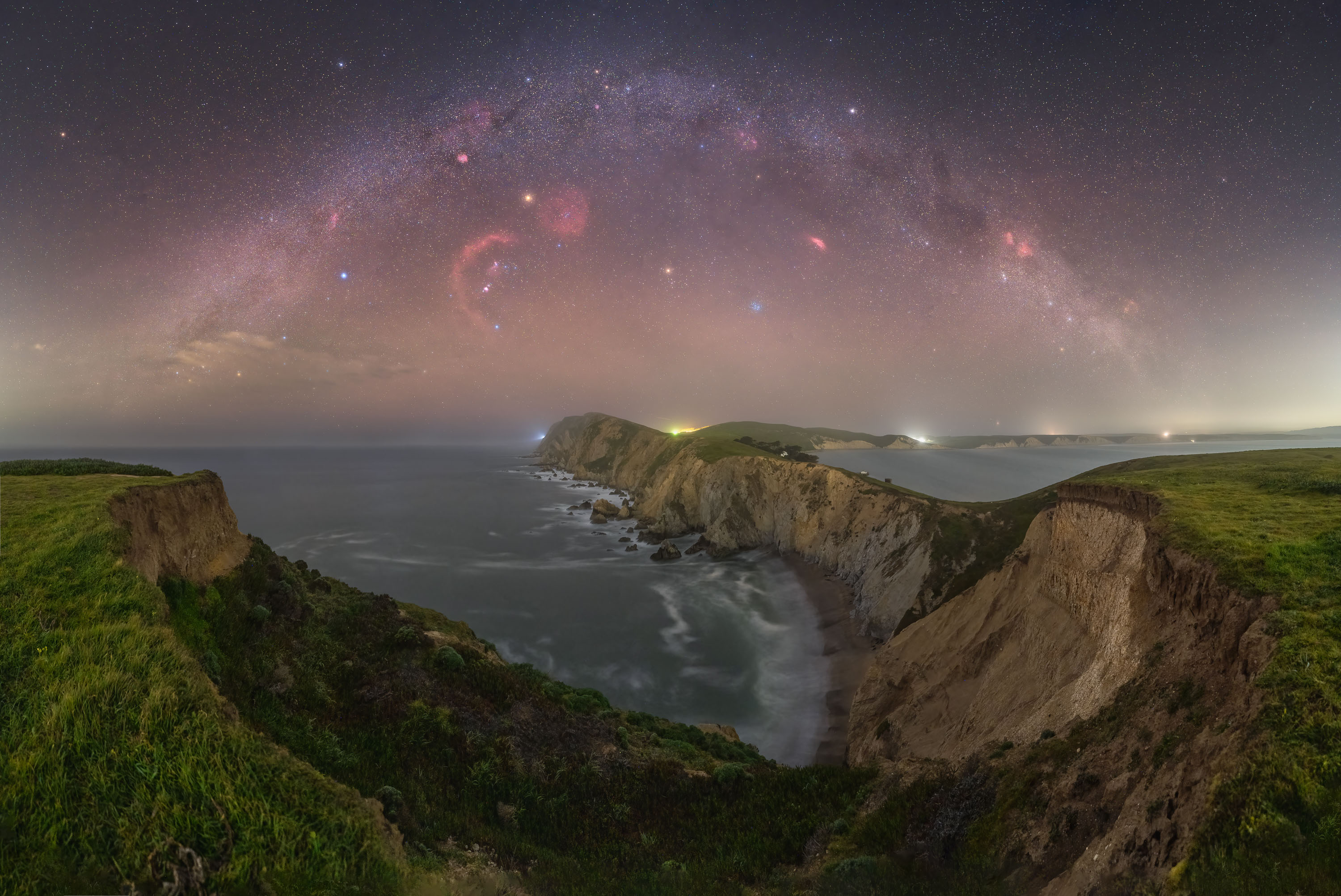 Las constelaciones del invierno boreal y un largo arco de la Vía Láctea se ponen en esta escena nocturna que mira hacia el océano Pacífico desde Point Reyes en la costa de California, en la Tierra. Sirio, la estrella alfa de Canis Major, es destacada debajo del arco estrellado hacia la izquierda. La Betelgeuse amarillenta de Orión, Aldebarán en Tauro y el azulado cúmulo estelar de las Pléyades también se encuentran entre la Vía Láctea y el horizonte noroeste cerca del centro de la escena. Las nebulosas visibles en la serie de exposiciones utilizadas para construir esta vista panorámica fueron capturadas a principios de marzo, pero son demasiado tenues para ser vistas a simple vista. Esa noche boreal, su extenso brillo incluye el semicírculo rojizo de la Bucle de Barnard en Orión y el NGC 1499, situado arriba y a la derecha de las Pléyades, también conocido como la Nebulosa de California.
