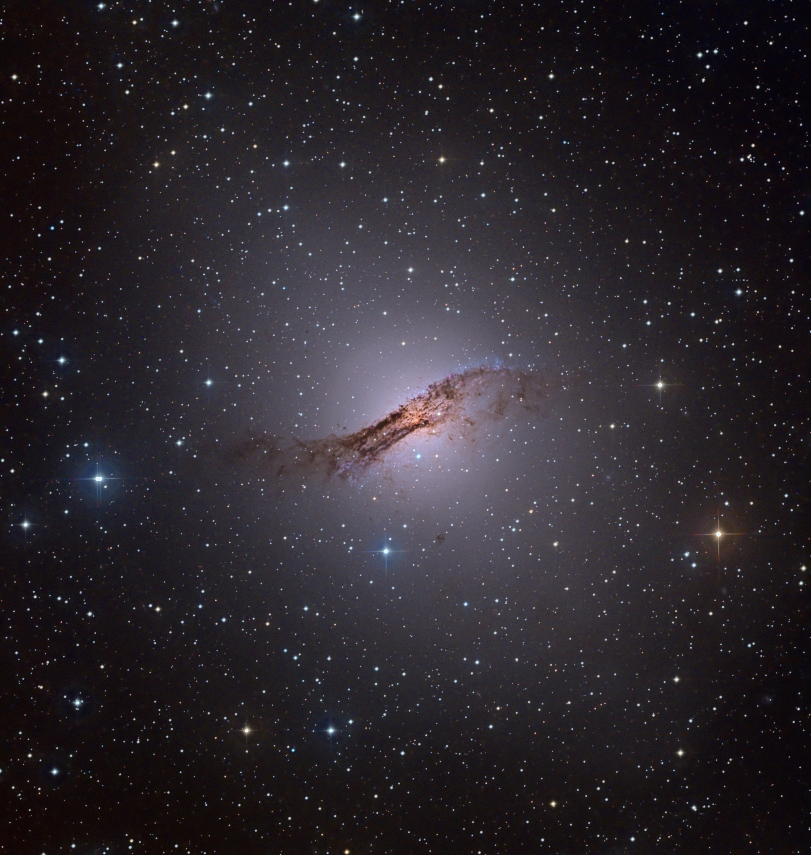 A mere 11 million light-years away, Centaurus A is the closest active galaxy to planet Earth. Spanning over 60,000 light-years, the peculiar elliptical galaxy also known as NGC 5128, is featured in this sharp telescopic view. Centaurus A is apparently the result of a collision of two otherwise normal galaxies resulting in a fantastic jumble of star clusters and imposing dark dust lanes. Near the galaxy's center, leftover cosmic debris is steadily being consumed by a central black hole with a billion times the mass of the Sun. As in other active galaxies, that process likely generates the enormous radio, X-ray, and gamma-ray energy radiated by Centaurus A.