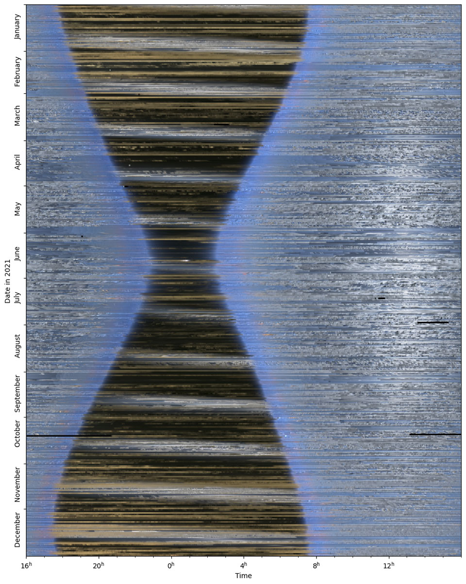 What if you could see the entire sky -- all at once -- for an entire year? That, very nearly, is what is pictured here. Every 15 minutes during 2021, an all-sky camera took an image of the sky over the Netherlands. Central columns from these images were then aligned and combined to create the featured keogram, with January at the top, December at the bottom, and the middle of the night running vertically just left of center. What do we see? Most obviously, the daytime sky is mostly blue, while the nighttime sky is mostly black. The twelve light bands crossing the night sky are caused by the glow of the Moon. The thinnest part of the black hourglass shape occurs during the summer solstice when days are the longest, while the thickest part occurs at the winter solstice. Yesterday was an equinox -- when night and day were equal -- and the northern-spring equinox from one year ago can actually be located in the keogram -- about three-quarters of the way up. Follow APOD on Instagram in: English, Indonesian, Persian, Portuguese or Taiwanese