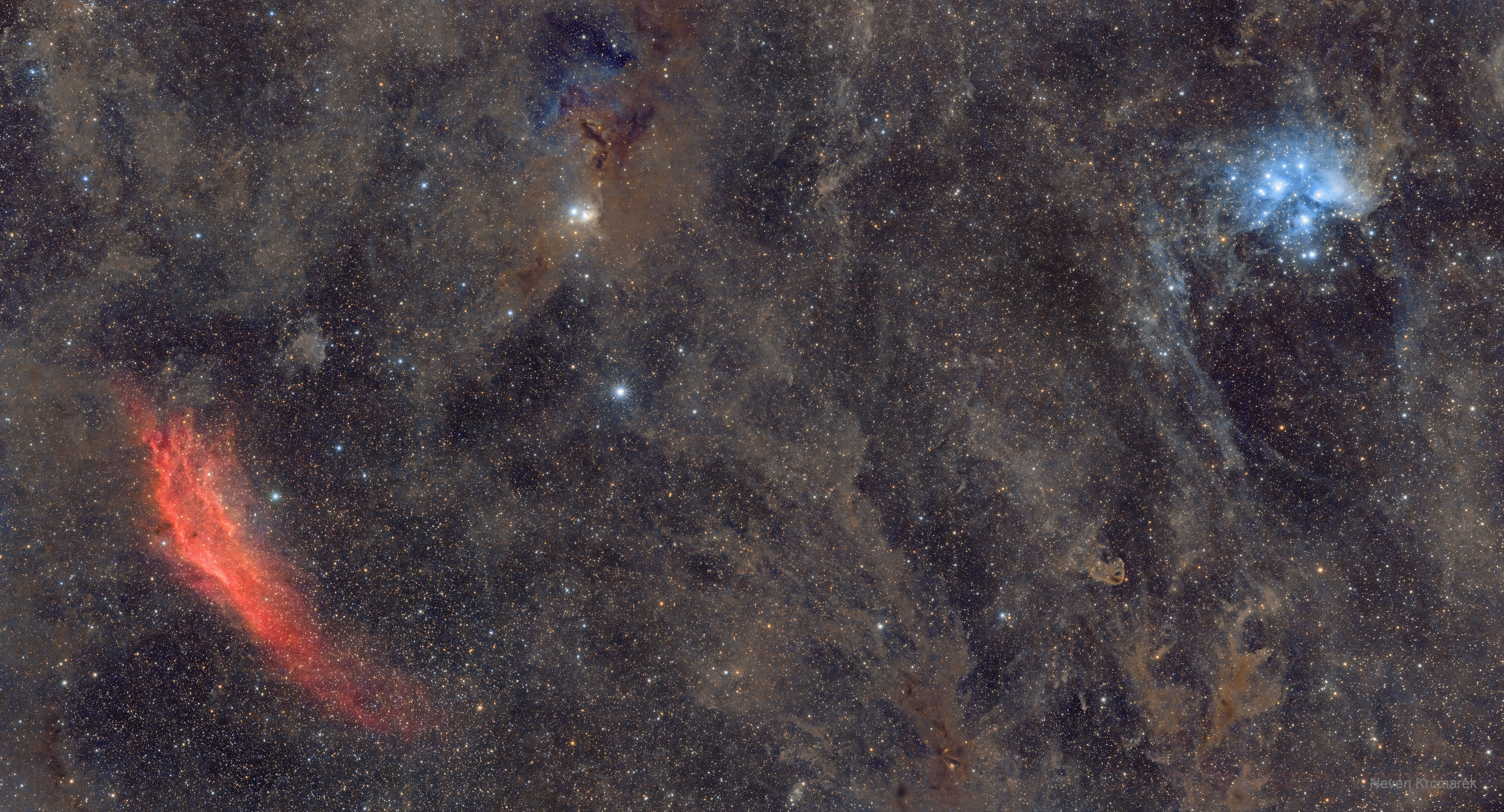 En la parte superior derecha, vestida de azul, se encuentra la Pléyades. También conocida como las Siete Hermanas y M45, la Pléyades es uno de los cúmulos abiertos más brillantes y fáciles de observar en el cielo. La Pléyades contiene más de 3,000 estrellas, se encuentra a unos 400 años luz de distancia y tiene un tamaño de aproximadamente 13 años luz. Rodeando a las estrellas hay un espectacular nebulosa de reflexión azul formada por fina polvo. Una leyenda común afirma que una de las estrellas más brillantes ha perdido brillo desde que se le dio nombre al cúmulo. En la parte inferior izquierda, brillando en rojo, se encuentra la Nebulosa de California. Nombrada por su forma, la Nebulosa de California es mucho más tenue y, por lo tanto, más difícil de ver que la Pléyades. También conocida como NGC 1499, esta masa de gas hidrógeno brillante en rojo se encuentra a unos 1,500 años luz de distancia. Aunque cabrían aproximadamente 25 lunas llenas entre ellas, la imagen compuesta de campo amplio y profundo mostrada aquí las ha capturado a ambas. Una inspección cuidadosa de la imagen profunda también revelará la región de formación estelar IC 348 y la nube molecular LBN 777 (la Nebulosa del Cisne Bebé).