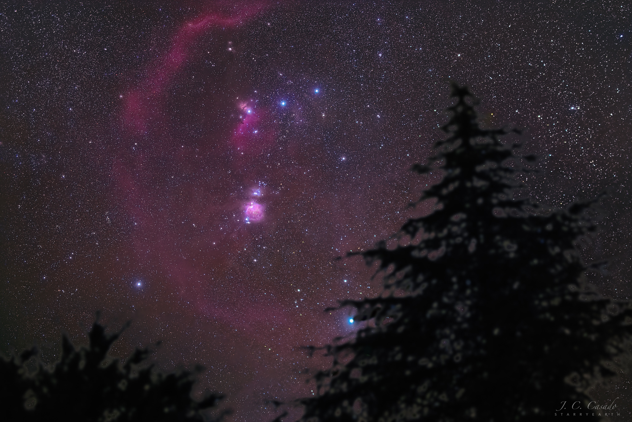 Tomada con una cámara fija a un trípode, muchas exposiciones cortas fueron alineadas con las estrellas para revelar esta hermosa imagen de la oscura noche. Capturada cerca del pueblo rural de Albany`a, en la esquina nordeste de España, las tres estrellas de la cintura de Orión se extienden a través del centro superior en el marco estrellado. Alnitak, la más oriental (izquierda) de las estrellas de la cintura, se ve junto al brillo más difuso de la Nebulosa de la Llama y al notch oscuro de la famosa Nebulosa del Caballo de Bucefalo. Fácilmente visible a simple vista, la Gran Nebulosa de Orión se encuentra debajo de las estrellas de la cintura. A solo 1500 años luz de distancia, es la mayor guardería estelar más cercana a nuestro planeta. Aunque mejor vista en fotografías, el amplio y tenue arco de la Bucle de Barnard parece abrazar las estrellas y nebulosas más brillantes de Orión. En la primavera boreal, la familiar constelación del invierno boreal está poniéndose. Cerca del horizonte occidental, hacia la parte inferior derecha, la aparentemente brillante supergigante azul Rigel de Orión apenas toca las ramas de un pino.