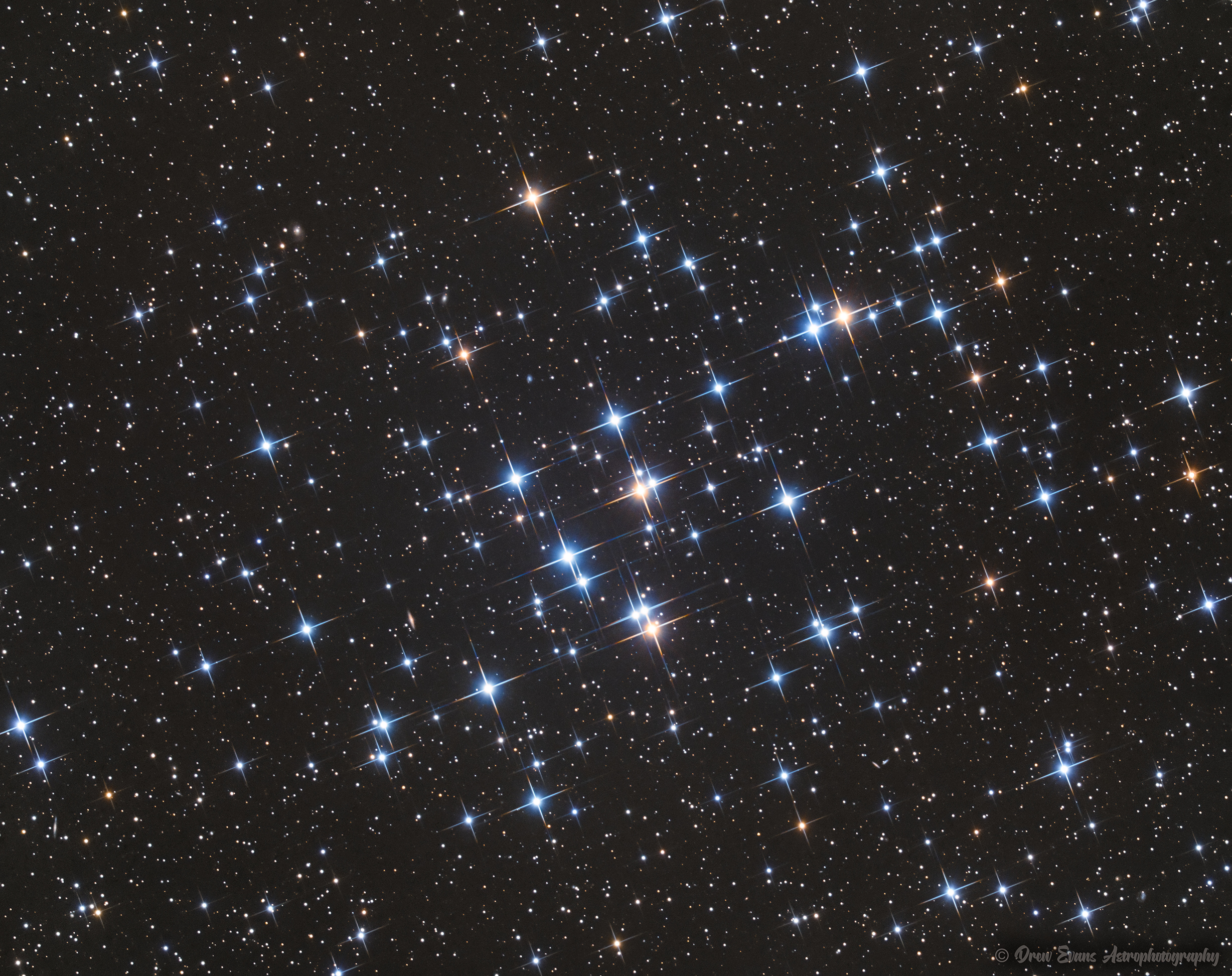 A tan solo 600 años luz de distancia, M44 es uno de los cúmulos estelares más cercanos a nuestro sistema solar. También conocido como Praesepe o el cúmulo de la Colmena, sus estrellas son jóvenes, con aproximadamente 600 millones de años, en comparación con los 4.5 mil millones de años de edad de nuestro Sol. Basándose en edades similares y en su movimiento a través del espacio, se cree que M44 y el aún más cercano cúmulo estelar de las Híades en Tauro nacieron juntos en la misma nube molecular grande. Un cúmulo abierto que abarca alrededor de 15 años luz, M44 contiene aproximadamente 1,000 estrellas y cubre unos 3 cuartos de luna (1.5 grados) en el cielo, dentro de la constelación de Cáncer. Visible a simple vista, M44 ha sido reconocido desde la antigüedad. Descrito como una nube tenue o neblina celeste mucho antes de ser incluido como la entrada número 44 en el catálogo del siglo XVIII de Charles Messier, el cúmulo no fue resuelto en sus estrellas individuales hasta que se disponía de telescopios. Un objetivo popular para observadores modernos equipados con binoculares, las pocas estrellas gigantes rojas de tono amarillento del cúmulo se dispersan por el campo de sus estrellas más brillantes y calientes de secuencia principal azul en esta instantánea telescópica del grupo. Dramáticas espinas de difracción que resaltan a los miembros más brillantes del cúmulo fueron creadas mediante hilos cruzados frente a la lente objetivo del telescopio.