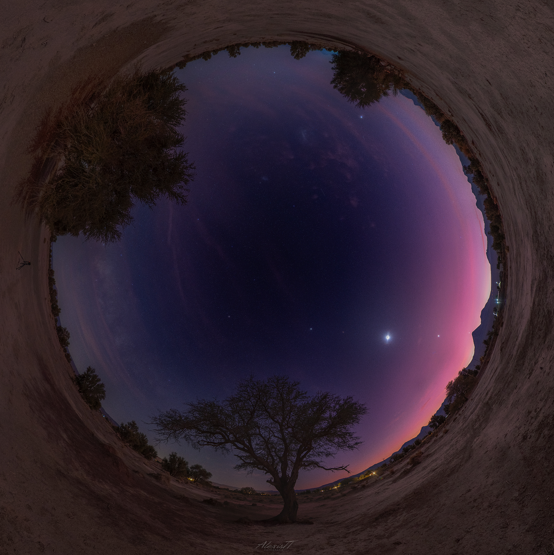 Sí, pero ¿alguna vez has visto todos los planetas juntos? Un raro desfile planetario ha estado ocurriendo en el cielo matutino durante gran parte de junio. La imagen de cielo completo con lente de pescado, tomada hace unos días por la mañana cerca de la ciudad de San Pedro de Atacama en Chile, capturó no solo todo el desfile planetario, sino también la Luna entre Marte y Venus. En orden, de izquierda a derecha a lo largo del plano de la eclíptica, los miembros de este retrato familiar del Sistema Solar son: Tierra, Saturno, Neptuno, Júpiter, Marte, Urano, Venus, Mercurio y Tierra. Para resaltar sus ubicaciones, Neptuno y Urano han sido artificialmente realzados. El volcán justo debajo de Mercurio es el Licancabur. En julio, Mercurio se moverá hacia el brillo del Sol, pero reaparecerá unos días después en el lado vespertino. Luego, en agosto, Saturno se desplazará hacia la dirección opuesta al Sol y por lo tanto será visible al atardecer en lugar de al amanecer. La próxima vez que los ocho planetas sean visibles simultáneamente en el cielo vespertino será en 2122.