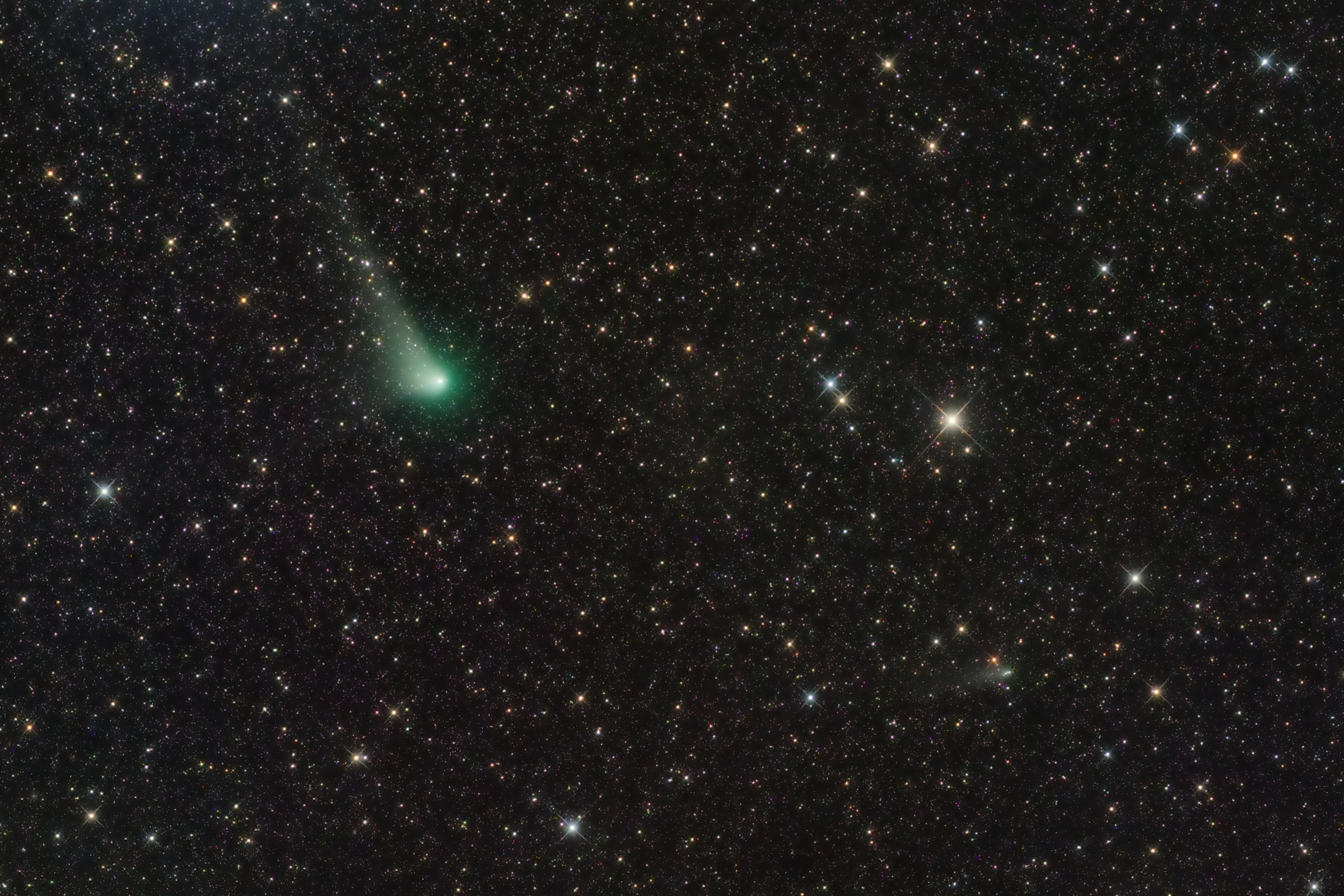 En su camino hacia el perihelio, el punto más cercano al Sol, que ocurrirá el 20 de diciembre, el cometa C/2017 K2 (PanSTARRS) sigue siendo un objeto de interés para observadores con telescopios, ya que atraviesa los cielos del hemisferio sur de la Tierra. Este cometa, que visita por primera vez el sistema solar interior desde la lejana nube de Oort, muestra una coma de color verde y una cola de polvo blanquecina de aproximadamente medio grado de longitud, ubicada en la parte superior izquierda en una imagen profunda tomada el 21 de septiembre. Comparte el campo estelar hacia la constelación de Escorpión con otro cometa, el 73P/Schwassmann-Wachmann 3, visible a unos 1 grado debajo y a la derecha de PanSTARRS. Los astrónomos estiman que el cometa C/2017 K2 (PanSTARRS), que visita por primera vez el sistema solar interior, ha estado viajando desde la nube de Oort hacia el interior a lo largo de una órbita hiperbólica durante aproximadamente 3 millones de años. Por su parte, el cometa Schwassmann-Wachmann 3 es más conocido. Este cometa periódico recorre su propia órbita elíptica, desde más allá de la órbita de Júpiter hasta la vecindad de la órbita terrestre, cada 5.4 años. En la imagen del 21 de septiembre, este cometa PanSTARRS se encontraba a unos 20 minutos luz de la Tierra. Por su parte, Schwassmann-Wachmann 3, que se ha estado desintegrando desde 1995, se encontraba a unos 7.8 minutos luz de distancia.