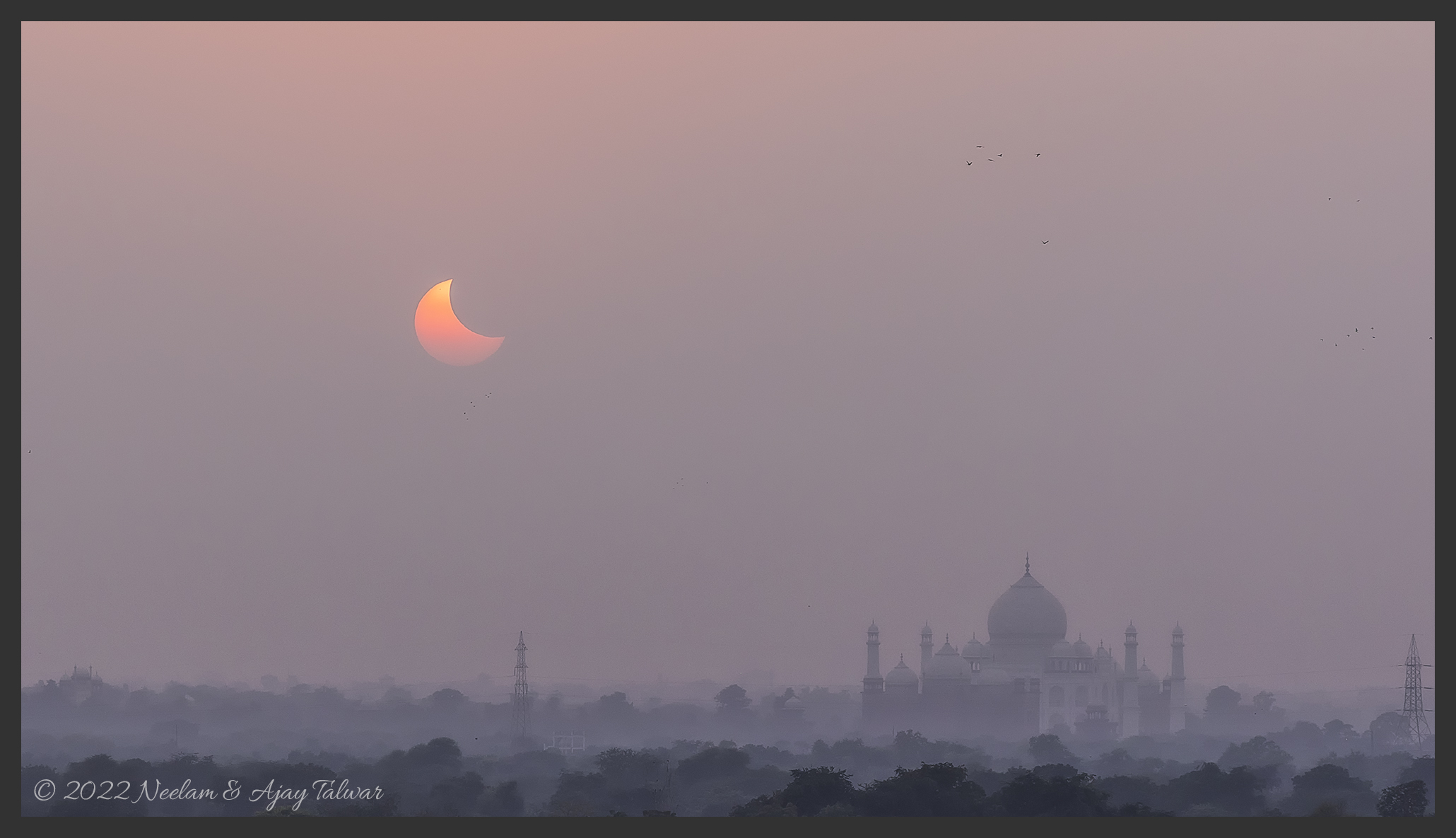 El 25 de octubre, el Sol y la Luna Nueva se pusieron juntos, según se observó desde Agra, India. Su cercana conjunción cerca del horizonte occidental, un eclipse solar parcial, fue capturada en esta vista elevada en un cielo nebuloso cerca del domo solitario del Taj Mahal. Por supuesto, el eclipse solar parcial también fue visible desde la mayor parte de Europa, el norte de África, el Medio Oriente y las zonas occidentales de Asia. Este eclipse fue el segundo y último de los dos eclipses solares (ambos parciales) de 2022. Pero la próxima Luna Llena pasará a través de la sombra de la Tierra el 7/8 de noviembre, en un eclipse lunar total.