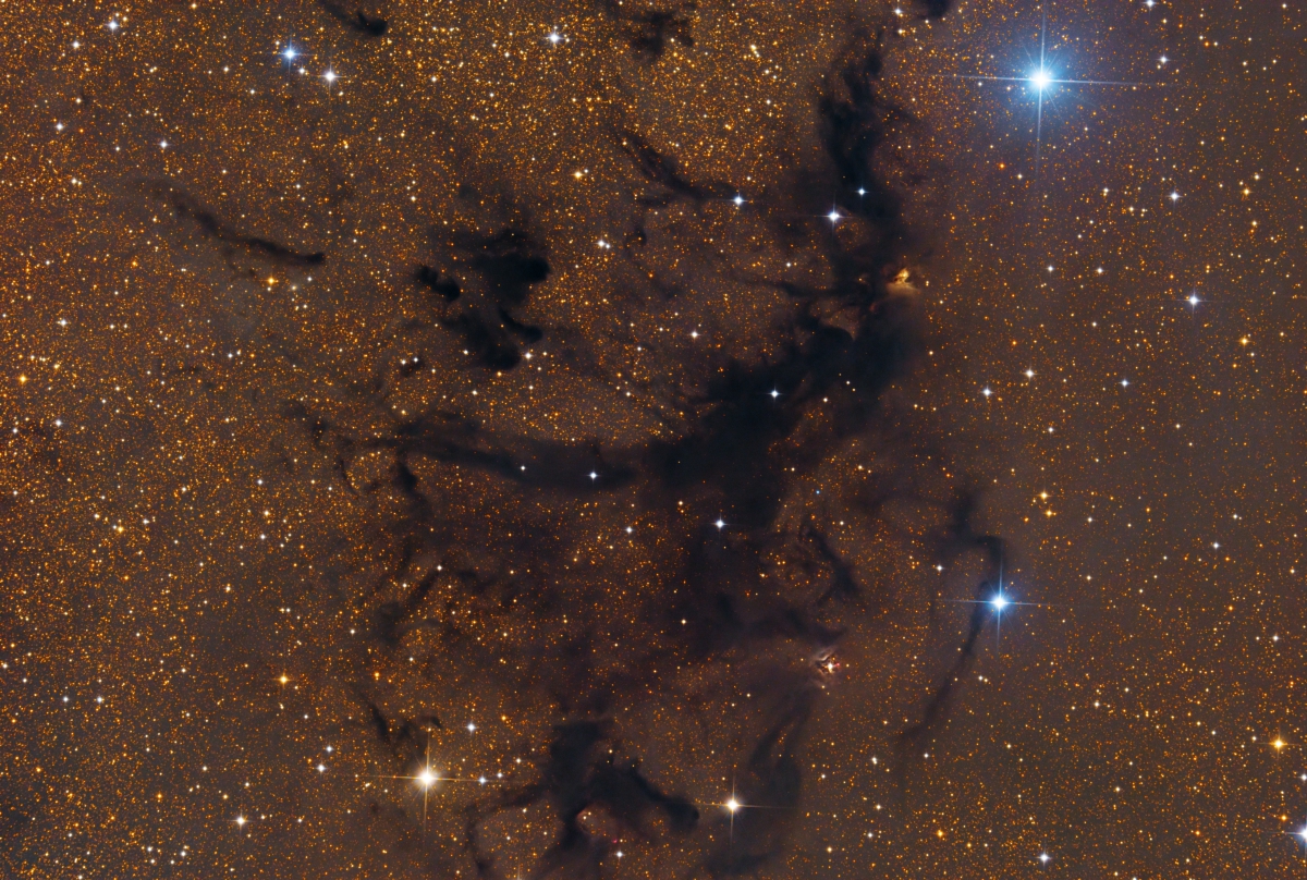 Part of a dark expanse that splits the crowded plane of our Milky Way galaxy, the Aquila Rift arcs through planet Earth's skies near bright star Altair. In eerie silhouette against the Milky Way's faint starlight, its dusty molecular clouds likely contain raw material to form hundreds of thousands of stars and astronomers search the dark clouds for telltale signs of star birth. This telescopic close-up looks toward the region at a fragmented Aquila dark cloud complex identified as LDN 673, stretching across a field of view slightly wider than the full moon. In the scene, visible indications of energetic outflows associated with young stars include the small red tinted nebulosity RNO 109 above and right of center, and Herbig-Haro object HH32 below. These dark clouds might look scary, but they're estimated to be some 600 light-years away. At that distance, this field of view spans about 7 light-years.