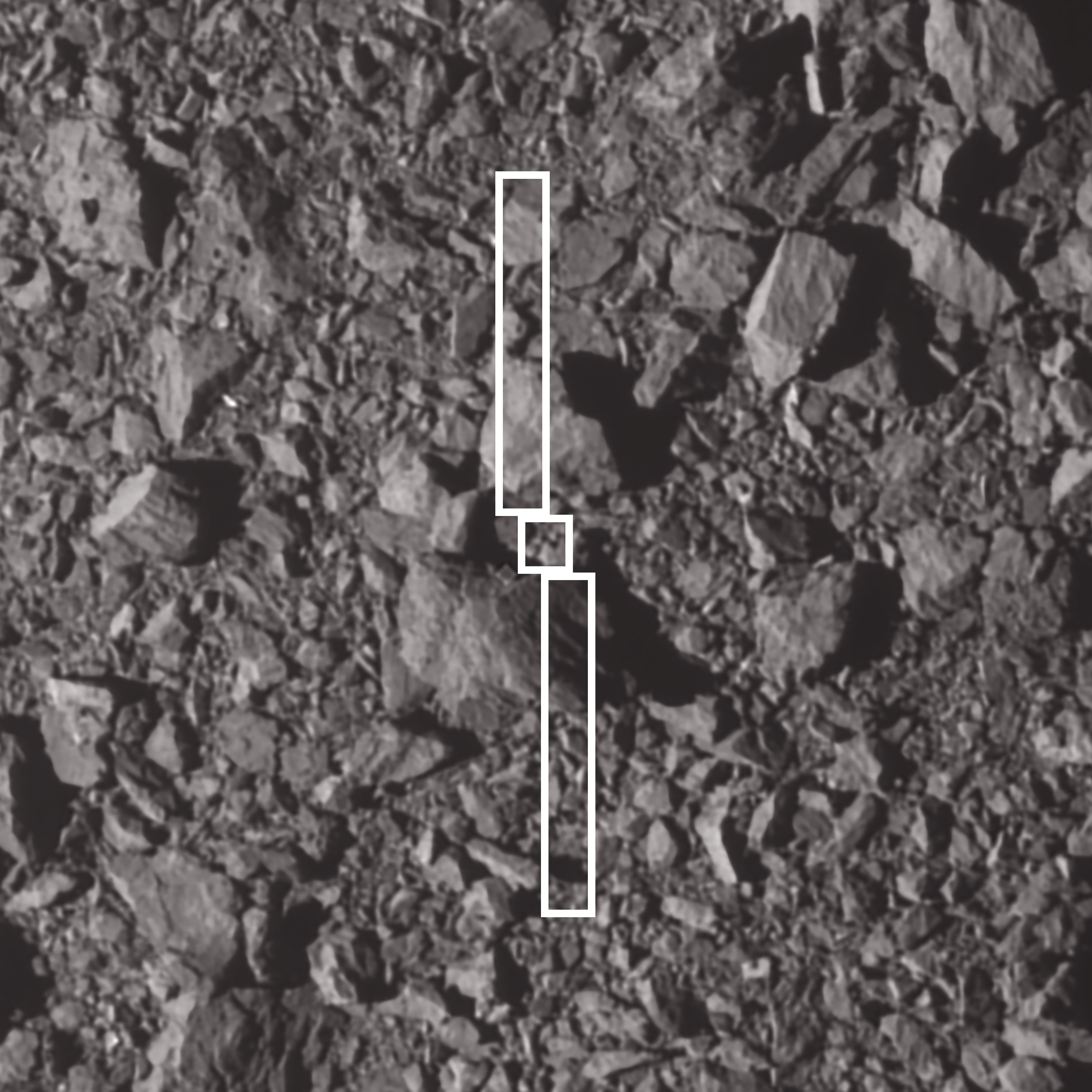 En la primera misión de defensa planetaria desde la Tierra, la nave espacial DART capturó esta imagen de cerca el 26 de septiembre de 2022, tres segundos antes de estrellarse contra la superficie del satélite asteroidal Dimorphos. El contorno de la nave espacial, con dos largas placas solares, se traza en su punto de impacto proyectado entre dos rocas. La roca más grande tiene aproximadamente 6.5 metros de diámetro. Mientras que la nave espacial DART (Double Asteroid Redirection Test) tenía una masa de unos 570 kilogramos, la masa estimada de Dimorphos, el miembro más pequeño de un sistema binario de asteroides cercanos a la Tierra, era de aproximadamente 5 mil millones de kilogramos. El impacto directo de la nave espacial alteró de manera medible la velocidad de Dimorphos en una fracción de un por ciento, reduciendo su período orbital de 12 horas alrededor de su compañero asteroidal más grande, 65803 Didymos, en aproximadamente 33 minutos. Además de demostrar con éxito una técnica para cambiar la órbita de un asteroide que podría prevenir futuros impactos asteroidales en la Tierra, el experimento de impacto a escala planetaria ha dado a Dimorphos, que tiene un tamaño de 150 metros, una cola similar a la de un cometa compuesta por material expulsado.