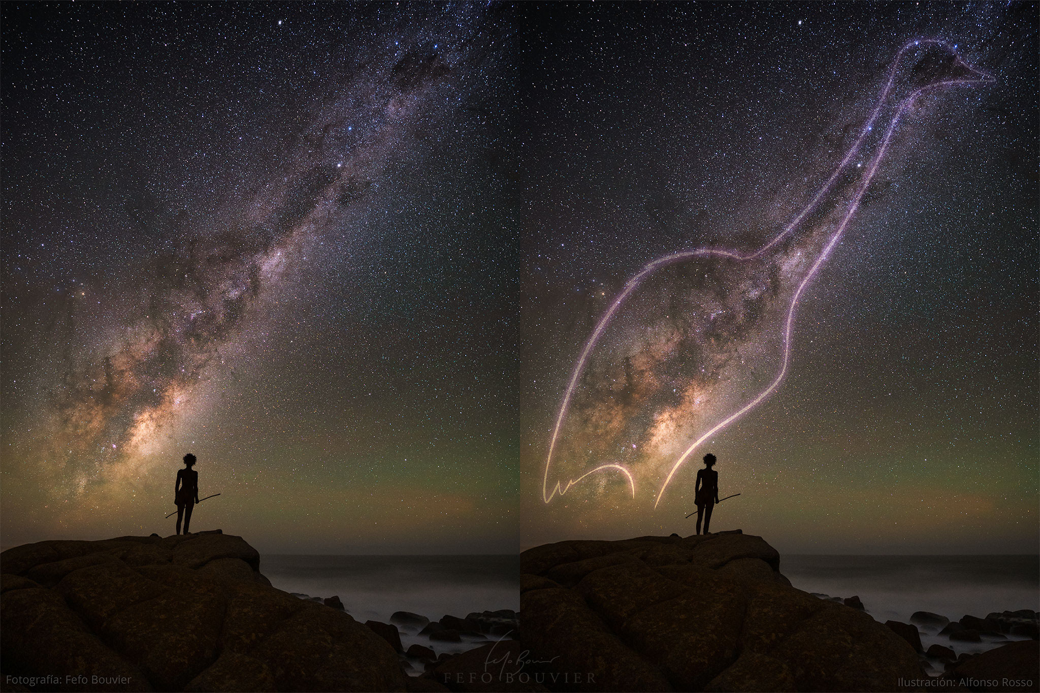 ¿Has visto al pájaro en la Vía Láctea? Más allá del hombre en la Luna, el cielo nocturno está lleno de historias, y las culturas a lo largo de la historia han proyectado algunas de sus leyendas más perdurables sobre las estrellas y el polvo que se extiende sobre nosotros. Generaciones de personas ven estos iconos celestes, escuchan sus historias asociadas y las transmiten. La imagen mostrada no es solo un segmento de la banda central de nuestra galaxia Vía Láctea, sino también, según la tradición de varios pueblos nativos de Uruguay, el contorno de un gran pájaro llamado Ñandú. Además, la huella del Ñandú está asociada con la constelación del Cruce del Sur. En primer plano, en silueta, se encuentra una estatua de María Micaela Guyunusa, una mujer indígena del pueblo Charrúa que vivió en el siglo XIX y que perdura como símbolo de resistencia ante la colonización. La imagen compuesta fue tomada a mediados de abril en Cabo Polonio, Uruguay, con el océano Atlántico en el fondo.