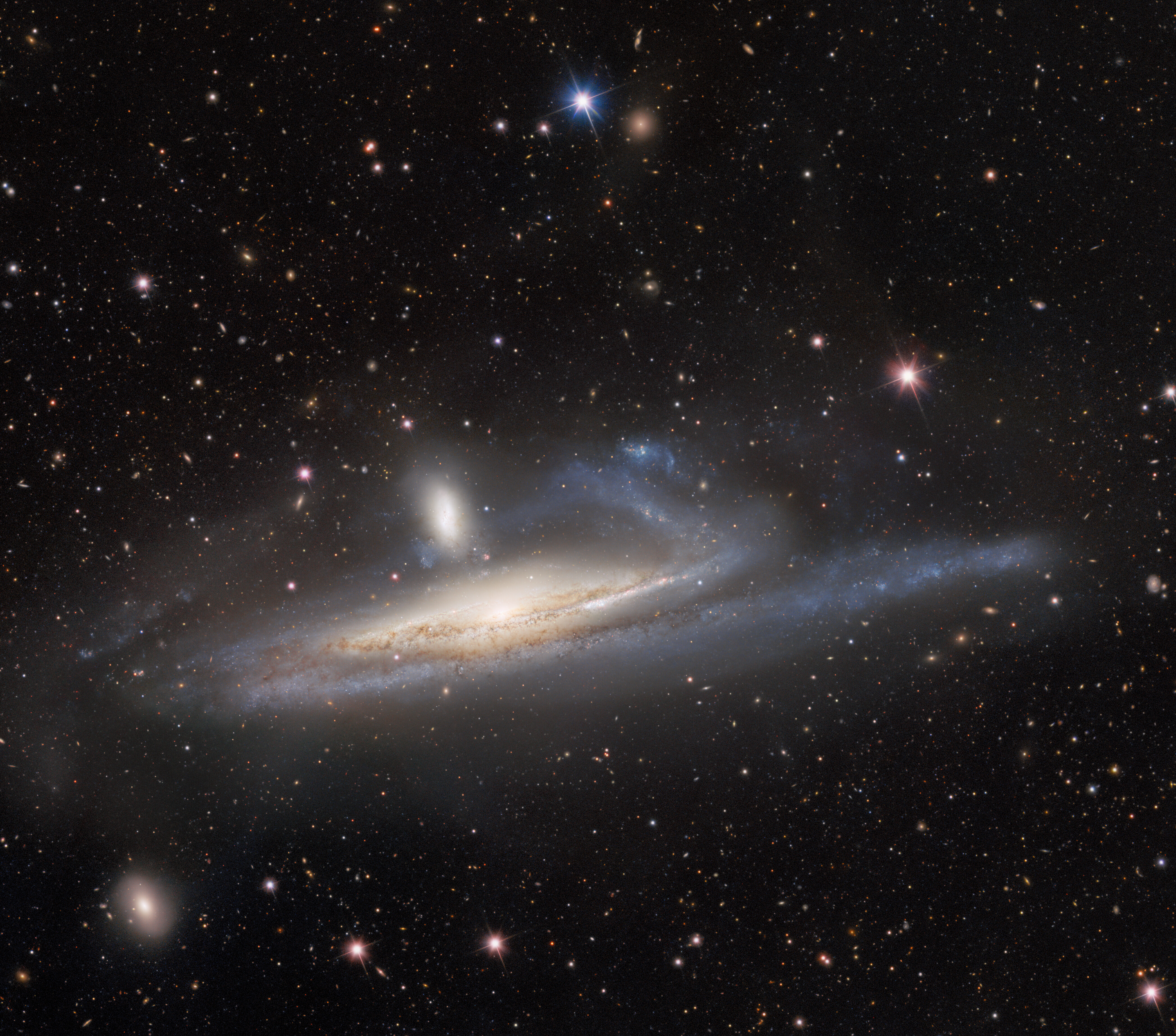 Large galaxies grow by eating small ones. Even our own galaxy engages in a sort of galactic cannibalism, absorbing small galaxies that are too close and are captured by the Milky Way's gravity. In fact, the practice is common in the universe and illustrated by this striking pair of interacting galaxies from the banks of the southern constellation Eridanus, The River. Located over 50 million light years away, the large, distorted spiral NGC 1532 is seen locked in a gravitational struggle with dwarf galaxy NGC 1531, a struggle the smaller galaxy will eventually lose. Seen nearly edge-on, spiral NGC 1532 spans about 100,000 light-years. The merging galaxies are captured in this sharp image from the Dark Energy Camera mounted on the National Science Foundation’s Blanco 4-meter Telescope at Cerro Tololo Inter-American Observatory in Chile. The NGC 1532/1531 pair is thought to be similar to the well-studied system of face-on spiral and small companion known as M51.