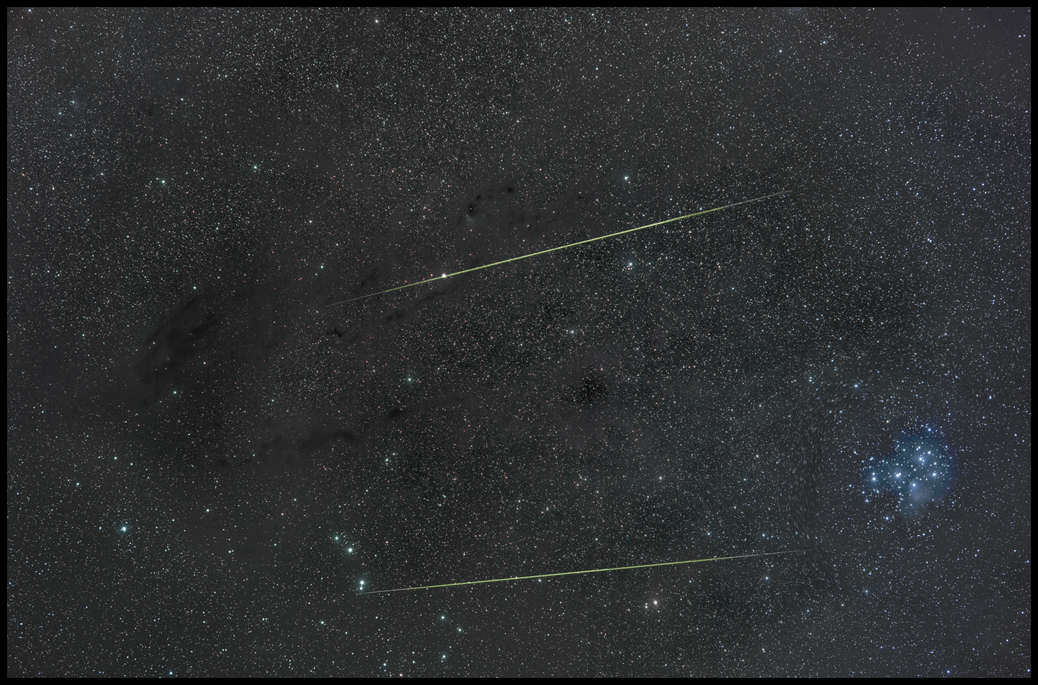 History's first known periodic comet, Comet Halley (1P/Halley), returns to the inner Solar System every 76 years or so. The famous comet made its last appearance to the naked-eye in 1986. But dusty debris from Comet Halley can be seen raining through planet Earth's skies twice a year during two annual meteor showers, the Eta Aquarids in May and the Orionids in October. In fact, an unhurried series of exposures captured these two bright meteors, vaporizing bits of Halley dust, during the early morning hours of October 23 against a starry background along the Taurus molecular cloud. Impacting the atmosphere at about 66 kilometers per second their greenish streaks point back to the shower's radiant just north of Orion's bright star Betelgeuse off the lower left side of the frame. The familiar Pleiades star cluster anchors the dusty celestial scene at the right.