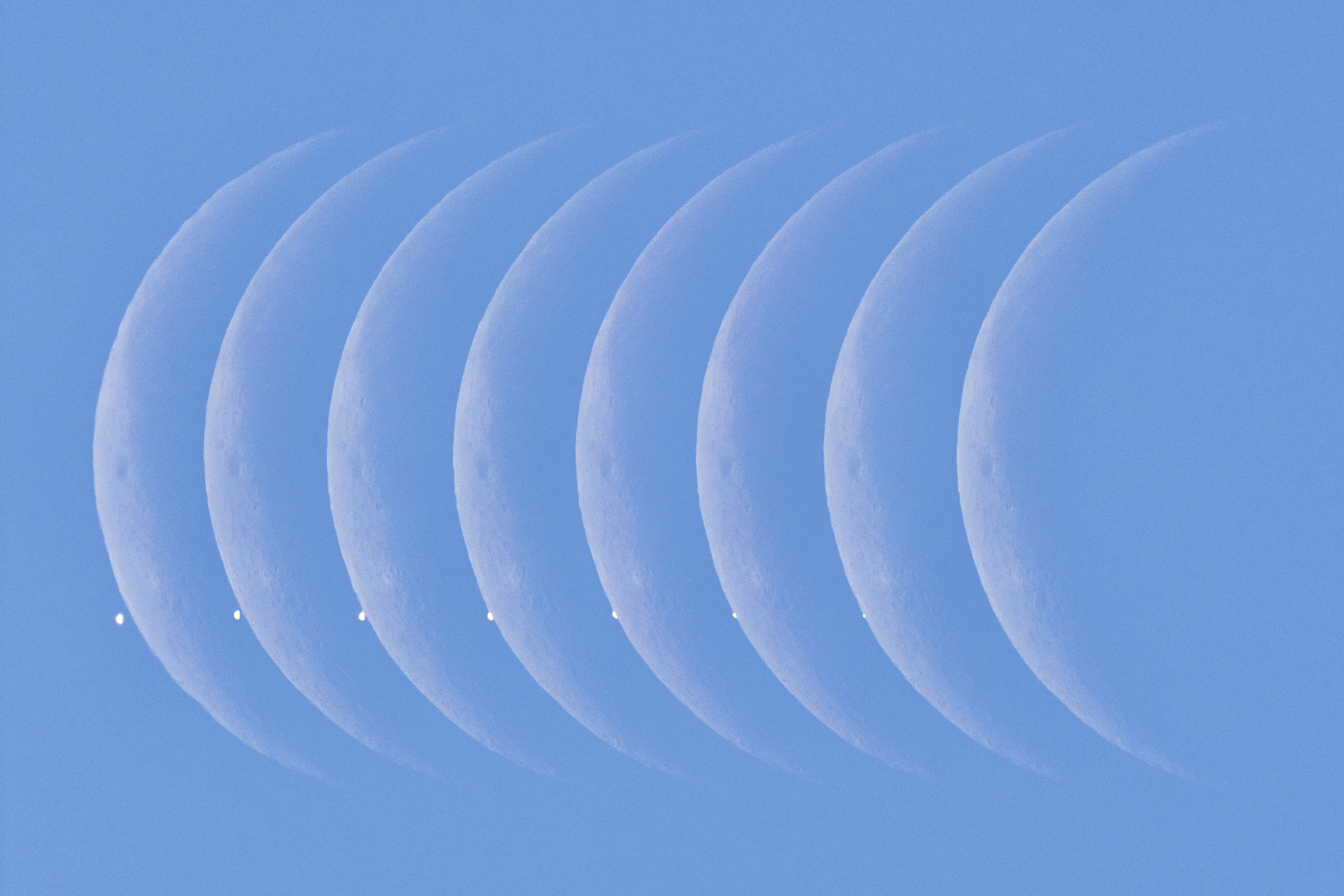 Venus now appears as Earth's brilliant morning star, shining above the southeastern horizon before dawn. For early morning risers, the silvery celestial beacon rose predawn in a close pairing with a waning crescent Moon on Thursday, November 9. But from some northern locations, the Moon was seen to occult or pass in front of Venus. From much of Europe, the lunar occultation could be viewed in daylight skies. This time series composite follows the daytime approach of Moon and morning star in blue skies from Warsaw, Poland. The progression of eight sharp telescopic snapshots, made between 10:56am and 10:58am local time, runs from left to right, when Venus winked out behind the bright lunar limb.