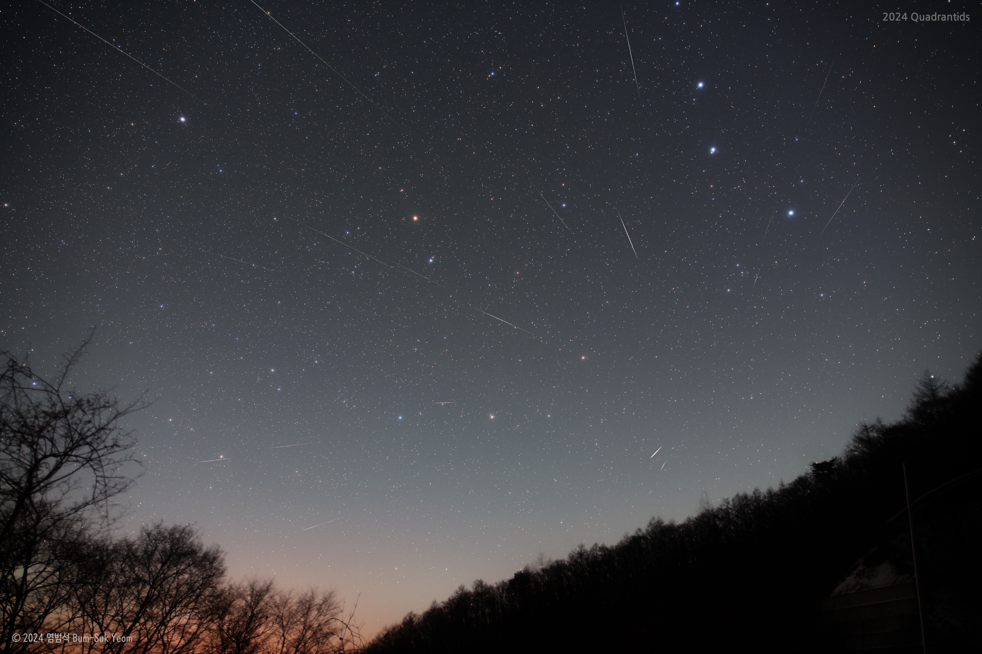 Named for a forgotten constellation, the Quadrantid Meteor Shower puts on an annual show for planet Earth's northern hemisphere skygazers. The shower's radiant on the sky lies within the old, astronomically obsolete constellation Quadrans Muralis. That location is not far from the Big Dipper asterism, known to some as the Plough, at the boundaries of the modern constellations Bootes and Draco. The Big Dipper "handle" stars are near the upper right corner in this frame, with the meteor shower radiant just below. North star Polaris is toward the top left. Pointing back toward the radiant, Quadrantid meteors streak through the night in this skyscape from Jangsu, South Korea. The composite image was recorded in the hours around the shower's peak on January 4, 2024. A likely source of the dust stream that produces Quadrantid meteors was identified in 2003 as an asteroid.