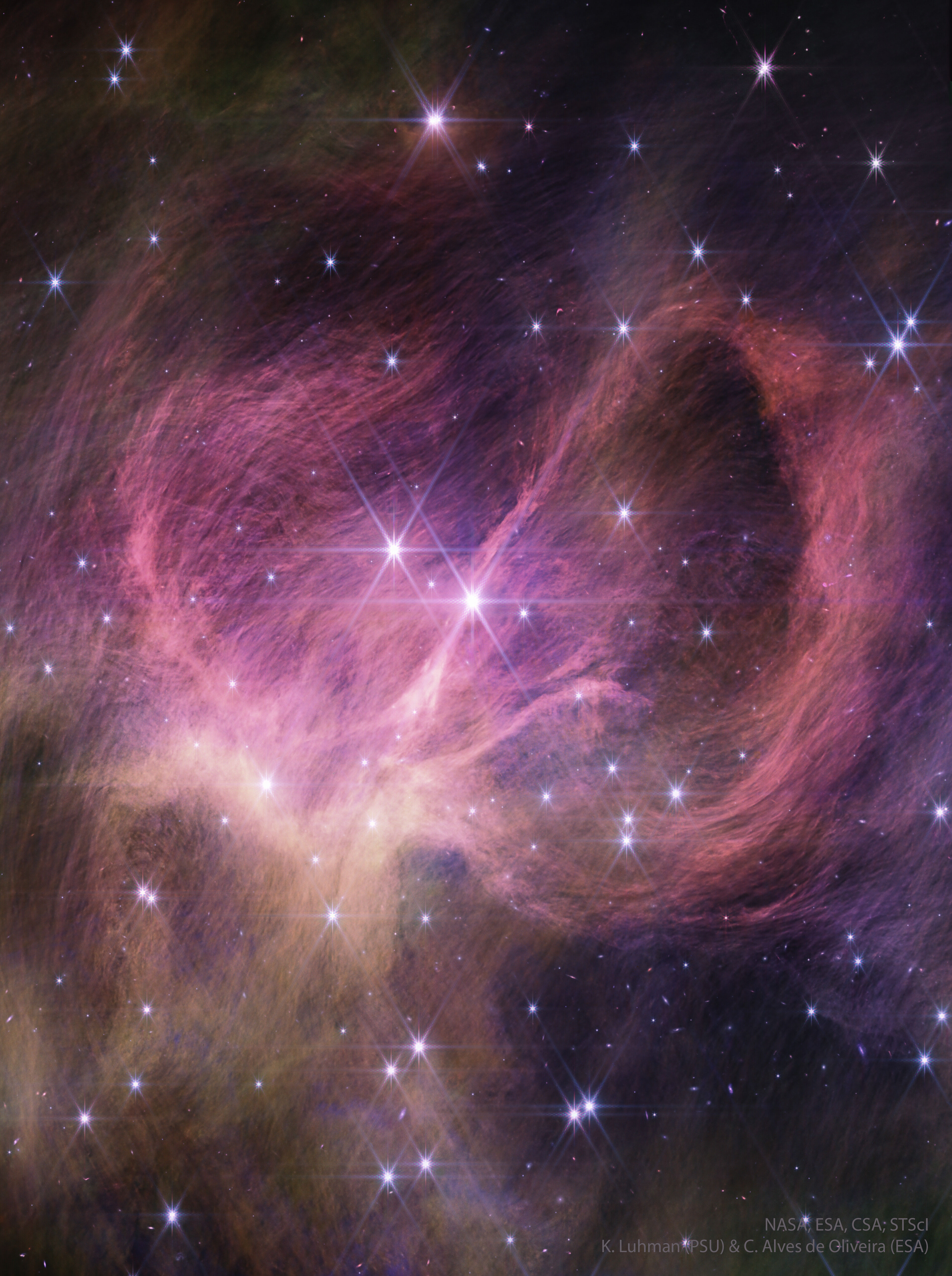 A veces, son las estrellas las más difíciles de ver las que resultan más interesantes. IC 348 es un joven cúmulo estelar que ilumina el polvo filamentoso que lo rodea. El polvo, de apariencia alargada y en espiral, aparece de color rosa en esta reciente imagen en infrarrojo del Telescopio Espacial Webb. En luz visible, este polvo refleja principalmente luz azul, otorgando al material circundante el familiar tono azul de una nebulosa de reflexión. Además de estrellas brillantes, se han localizado varios objetos fríos en IC 348, visibles porque brillan con mayor intensidad en luz infrarroja. Estos objetos se hipotetizan como enanas marrones de baja masa. La evidencia de esto incluye la detección de un compuesto químico atmosférico no identificado, probablemente un hidrocarburo, previamente observado en la atmósfera de Saturno. Estos objetos parecen tener masas ligeramente superiores a las de los planetas conocidos, solo unas pocas veces mayores que la de Júpiter. Juntos, estos hallazgos indican que este joven cúmulo estelar contiene algo digno de mención: enanas marrones de masa planetaria jóvenes que flotan libremente, sin orbitar ninguna otra estrella.