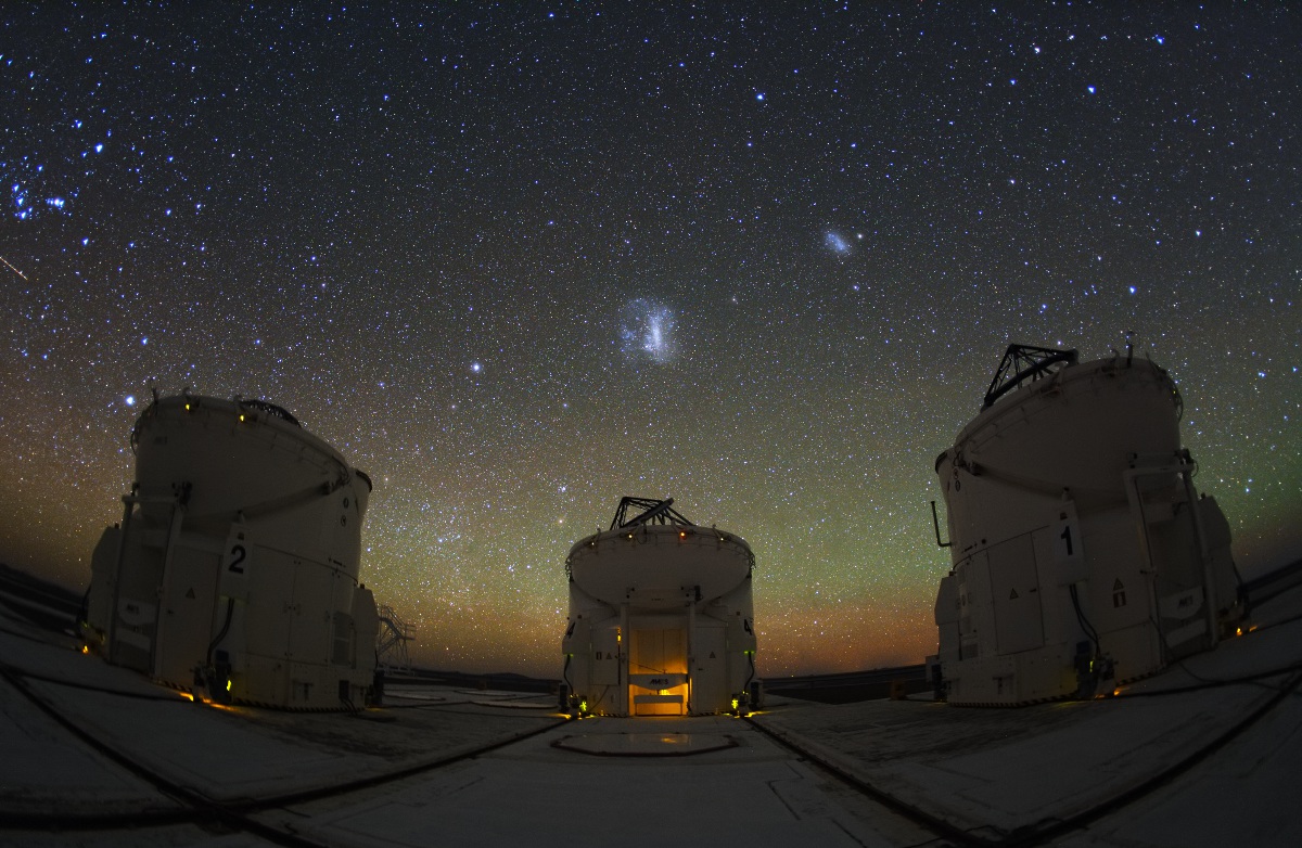 Despite their resemblance to R2D2, these three are not the droids you're looking for. Instead, the enclosures house 1.8 meter Auxiliary Telescopes (ATs) at Paranal Observatory in the Atacama Desert region of Chile. The ATs are designed to be used for interferometry, a technique for achieving extremely high resolution observations, in concert with the observatory's 8 meter Very Large Telescope units. A total of four ATs are operational, each fitted with a transporter that moves the telescope along a track allowing different arrays with the large unit telescopes. To work as an interferometer, the light from each telescope is brought to a common focal point by a system of mirrors in underground tunnels. Above these three ATs, the Large and Small Magellanic Clouds are the far, far away satellite galaxies of our own Milky Way. In the clear and otherwise dark southern skies, planet Earth's greenish atmospheric airglow stretches faintly along the horizon.