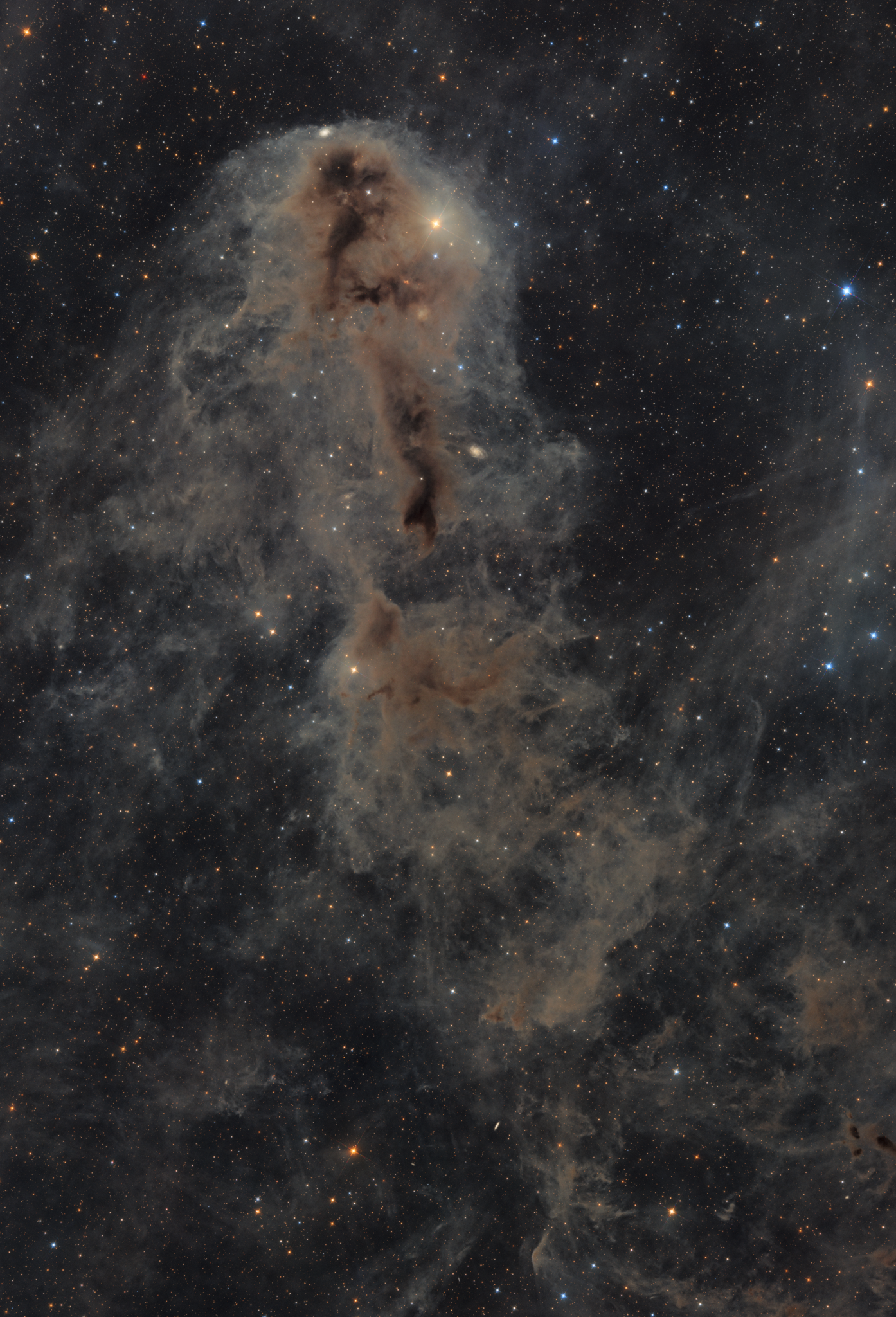 Estrellas están naciendo en la Nebulosa Oscura de Lynds (LDN) 1251. A unos 1000 años luz de distancia y flotando por encima del plano de nuestra galaxia Vía Láctea, la LDN 1251 también es conocida, menos atractivamente, como 'La Nebulosa del Pescado Podrido'. La nube molecular polvorienta forma parte de un complejo de nebulosas oscuras mapeadas hacia la región de la chispa de Cefeo. A lo largo del espectro, exploraciones astronómicas de las nubes interplanetarias opacas revelan choques y flujos energéticos asociados con estrellas recién nacidas, incluyendo el característico brillo rojizo de los objetos Herbig-Haro dispersos ocultos en la imagen. Galaxias distantes también se esconden en la escena, casi enterradas detrás de la extensa expansión polvorienta. Esta atractiva vista abarca más de cuatro lunas llenas en el cielo, o 35 años luz a la distancia estimada de la LDN 1251.