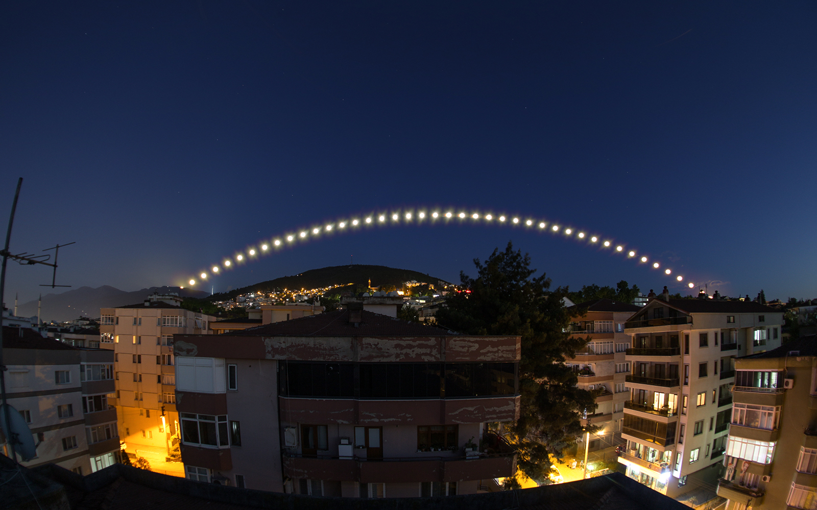 Al elevarse opuesta al Sol poniente, la Luna Llena de junio ocurrió dentro de aproximadamente 28 horas del solsticio. La Luna permanece cerca del camino del Sol a lo largo del plano de la eclíptica, por lo que mientras el Sol del solsticio ascendió alto en los cielos diurnos, la Luna Llena de junio permaneció baja esa noche, vista desde latitudes norteñas. De hecho, la Luna Llena abraza el horizonte en esta vista del cielo nocturno desde el tejado de Bursa, Turquía, el 21 de junio, compuesta a partir de exposiciones tomadas cada 10 minutos entre la puesta y la salida de la Luna. En 2024, la Luna también alcanzó un standstill lunar mayor, un extremo en el rango norte-sur mensual de la salida y puesta de la Luna causado por la precesión de la órbita lunar en un ciclo de 18,6 años. Como resultado, esta Luna Llena del solsticio de junio tuvo su salida y puesta más al sur a lo largo del horizonte.