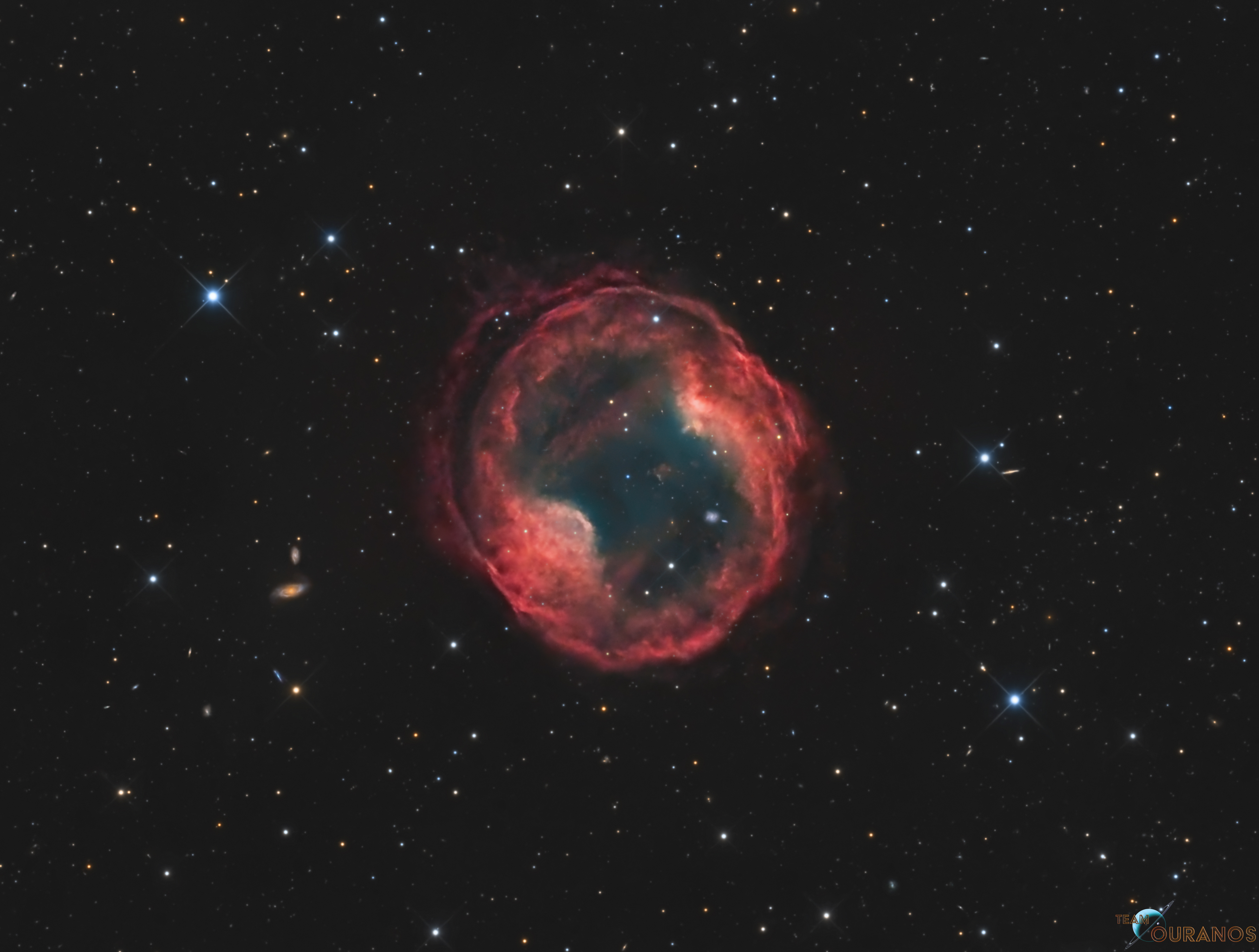 La nebulosa planetaria Jones-Emberson 1 es el velo de muerte de una estrella moribunda similar al Sol. Se encuentra a unos 1600 años luz de la Tierra, en dirección a la constelación perspicaz de Lince. Con un diámetro de aproximadamente 4 años luz, el resto expandido de la atmósfera de la estrella moribunda fue arrojado al espacio interestelar, cuando la estrella agotó su suministro central de hidrógeno y luego de helio para la fusión tras miles de millones de años. Cerca del centro de la nebulosa planetaria se encuentra lo que queda del núcleo estelar, una estrella enana blanca ardientemente caliente. También conocida como PK 164 +31.1, la nebulosa es tenue y muy difícil de observar a través del ocular de un telescopio. Pero esta imagen profunda, que combina más de 12 horas de tiempo de exposición, la muestra con un detalle excepcional. Estrellas dentro de nuestra propia galaxia Vía Láctea, así como galaxias en el fondo del universo, se dispersan por el claro campo de visión. Efímera en el escenario cósmico, Jones-Emberson 1 desaparecerá en los próximos miles de años. Su estrella enana blanca central caliente tardará miles de millones de años en enfriarse.