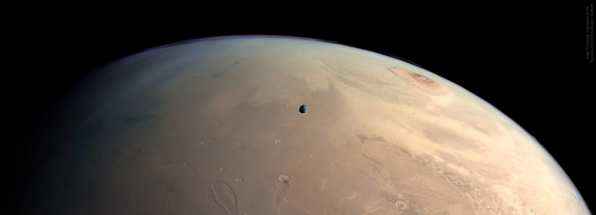 If you could fly over Mars, what might you see? The featured image shows exactly this in the form of a Mars Express vista captured over a particularly interesting region on Mars in July. The picture's most famous feature is Olympus Mons, the largest volcano in the Solar System, visible on the upper right. Another large Martian volcano is visible on the right horizon: Pavonis Mons. Several circular impact craters can be seen on the surface of the aptly named red planet. Impressively, this image was timed to capture the dark and doomed Martian moon Phobos, visible just left of center. The surface feature on the lower left, known as Orcus Patera, is unusual for its large size and oblong shape, and mysterious because the processes that created it still remain unknown. ESA's robotic Mars Express spacecraft was launched in 2003 and, among many notable science discoveries, bolstered evidence that Mars was once home to large bodies of water.