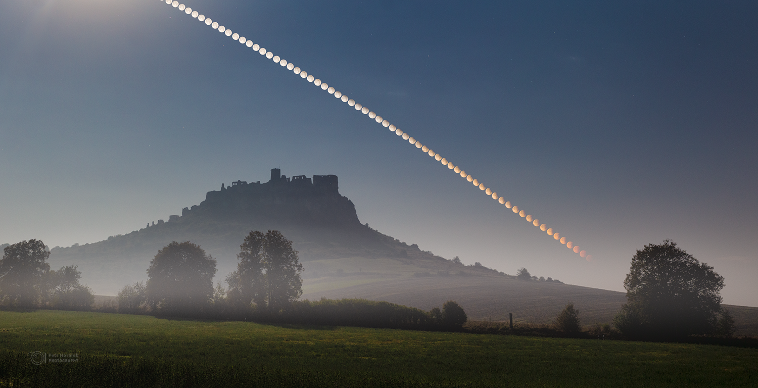 Para los habitantes del hemisferio norte, la Luna Llena de septiembre fue la Luna de Cosecha. El 17/18 de septiembre, la cara iluminada por el Sol de la Luna entró en sombra, rozando apenas la umbra de la Tierra, el cono oscuro y central del planeta, en un eclipse lunar parcial. Durante las dos horas y media antes del amanecer, una cámara fija a un trípode registró esta serie de exposiciones mientras la Luna de Cosecha en eclipse se ponía detrás del Castillo de Spiš en el enebrado cielo matutino del este de Eslovaquia. Famosa en festividades, historias y canciones, la Luna de Cosecha es simplemente el nombre tradicional de la luna llena más cercana al equinoccio de otoño. Según la tradición, el nombre es adecuado. A pesar de que las horas de luz disminuían a medida que terminaba la temporada de cultivo, los agricultores podían cosechar sus cultivos bajo la luz de una luna llena que brillaba desde la puesta del Sol hasta el amanecer. Esta Luna de Cosecha de septiembre también fue conocida por algunos como superluna, un término que se ha convertido en un nombre tradicional para una luna llena cerca del perigeo.