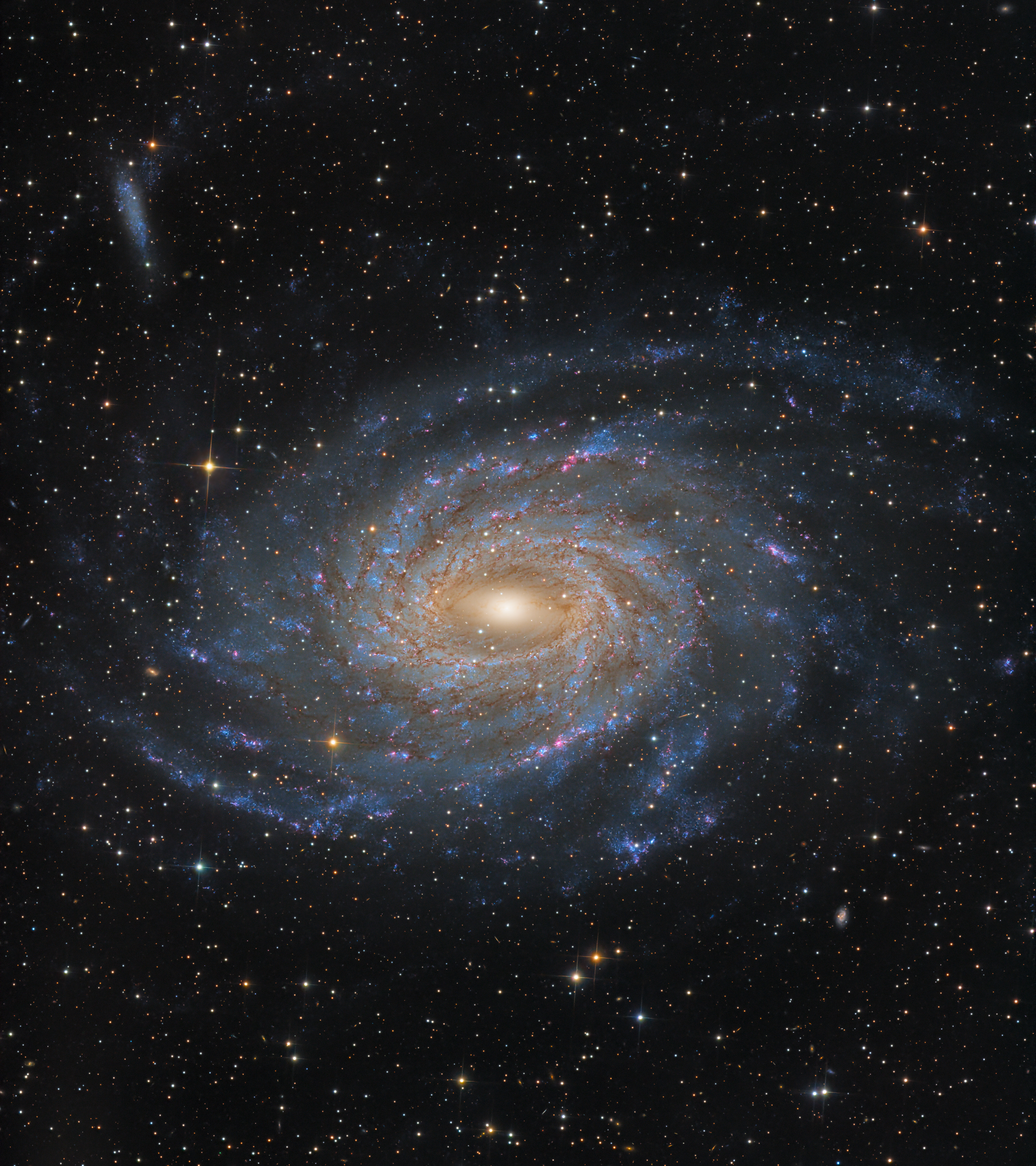 Big, beautiful spiral galaxy NGC 6744 is nearly 175,000 light-years across, larger than our own Milky Way. It lies some 30 million light-years distant in the southern constellation Pavo but appears as only a faint smudge in the eyepiece of a small telescope. We see the disk of the nearby island universe tilted towards our line of sight in this remarkably deep and detailed galaxy portrait, a telescopic image that spans an area about the angular size of a full moon. In it, the giant galaxy's elongated yellowish core is dominated by the light from old, cool stars. Beyond the core, grand spiral arms are filled with young blue star clusters and speckled with pinkish star forming regions. An extended arm sweeps past smaller satellite galaxy NGC 6744A at the upper left. NGC 6744's galactic companion is reminiscent of the Milky Way's satellite galaxy the Large Magellanic Cloud.