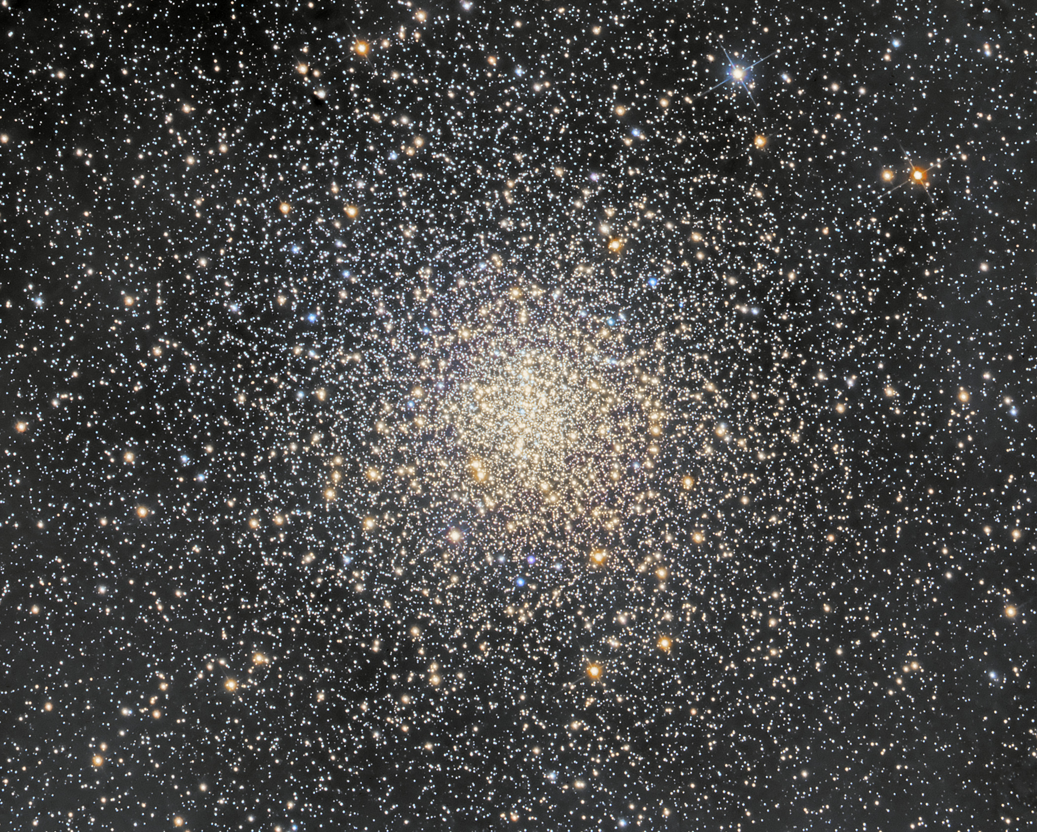 Messier 4 can be found west of bright red-giant star Antares, alpha star of the constellation Scorpius. M4 itself is only just visible from dark sky locations, even though the globular cluster of 100,000 stars or so is a mere 5,500 light-years away. Still, its proximity to prying telescopic eyes makes it a prime target for astronomical explorations. Recent studies have included Hubble observations of M4's pulsating cepheid variable stars, cooling white dwarf stars, and ancient, pulsar orbiting exoplanet PSR B1620-26 b. This sharp image was captured with a small telescope on planet Earth. At M4's estimated distance it spans about 50 light-years across the core of the globular star cluster.
