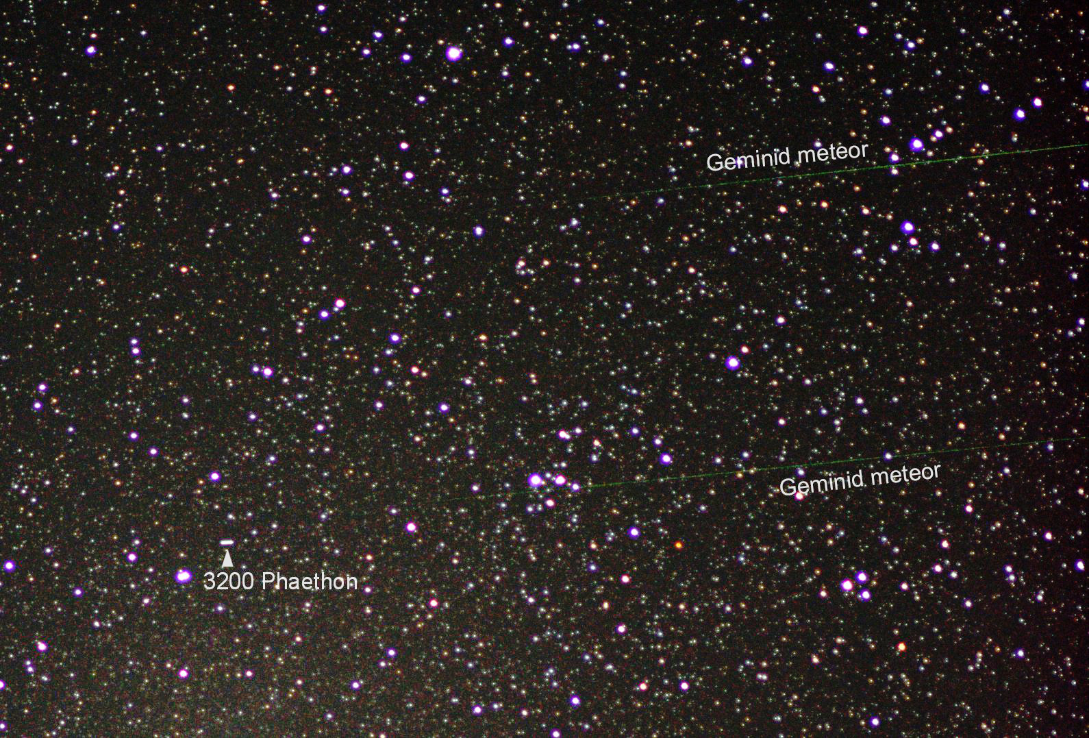 Basado en su órbita bien medida, 3200 Phaethon (que suena como FAY-eh-thon) se reconoce como la fuente del flujo de meteoroides responsable de la lluvia anual de meteoros Géminidas. Aunque la mayoría de los progenitores de las lluvias de meteoros son cometas, 3200 Phaethon es un asteroide cercano a la Tierra conocido y seguido de cerca con un período orbital de 1.4 años. Rocoso y expuesto al calor solar, su perihelio o punto más cercano al Sol está bien dentro de la órbita del planeta más interno, Mercurio. En este campo de visión telescópico, el rápido movimiento del asteroide frente a las tenues estrellas de fondo de la constelación heroica de Perseo dejó una corta trayectoria durante el tiempo total de exposición de dos minutos. Las (tenues) líneas paralelas de sus hijos meteoríticos cruzaron mucho más rápidamente la escena. El retrato familiar fue registrado cerca del pico muy activo de la lluvia de meteoros Géminidas el 13 de diciembre de 2017. Ese fue solo tres días antes del histórico acercamiento cercano de 3200 Phaethon a la Tierra. Este año, la noche del 13 de diciembre debería ver nuevamente el pico de la lluvia de meteoros Géminidas, pero los meteoros tenues serán enmascarados por la luz brillante de la luna casi llena.