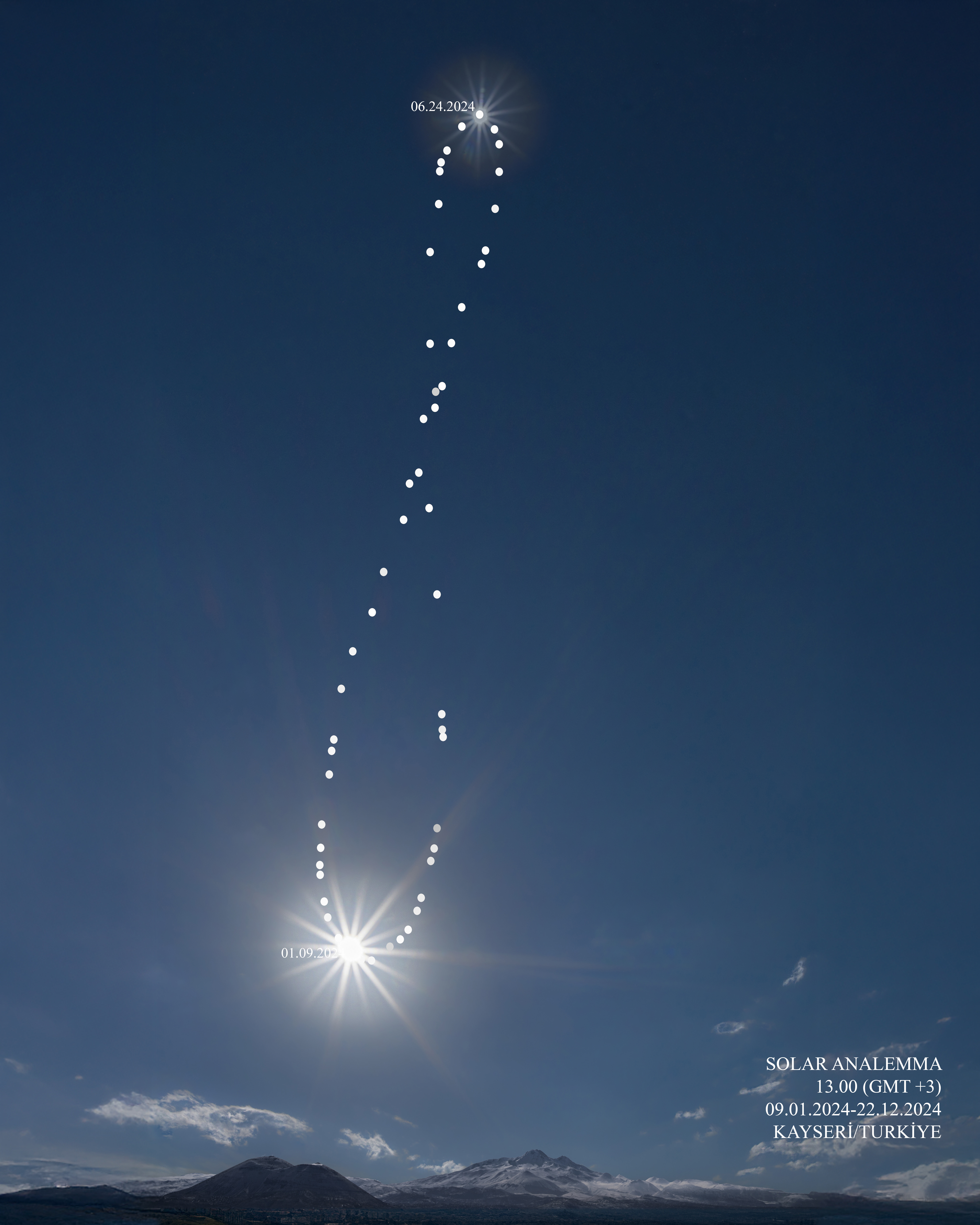 Grabado durante 2024, esta serie de imágenes que abarca todo el año revela un patrón en el desplazamiento estacional del movimiento diario del Sol a través del cielo de la Tierra. Conocido por algunos como analema, la curva en forma de ocho fue capturada en exposiciones tomadas únicamente a la 1 p. m. hora local en días despejados desde Kayseri, Turquía. Por supuesto, la posición del Sol en las fechas de los solsticios de 2024 se encontraba en la parte superior e inferior de la curva. Estas corresponden al inicio astronómico del verano y el invierno en el hemisferio norte. Los puntos a lo largo de la curva, a medio camino entre los solsticios, pero no el punto donde se cruza la curva en forma de ocho, marcan los equinoccios de 2024 y el inicio de la primavera y el otoño. El volcán inactivo Erciyes se encuentra a lo largo del horizonte sur en el paisaje celeste de 2024.