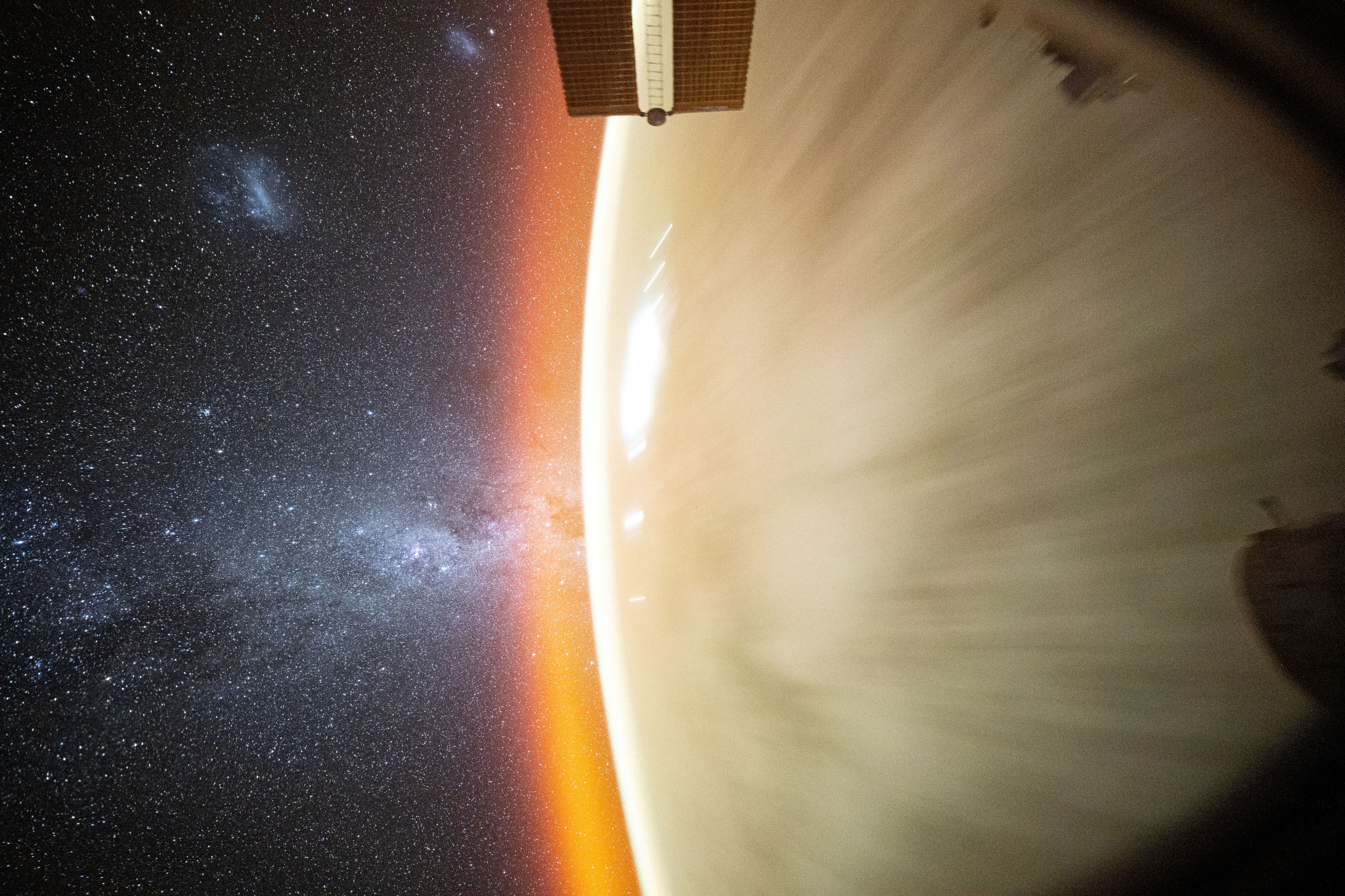 The plane of our Milky Way galaxy extends beyond the limb of planet Earth in this space age exposure captured by astronaut Don Pettit. His camera, with low light and long duration settings, was pointed out the window of a Dragon crew spacecraft docked with the International Space Station on January 29. The orbital outpost was at an altitude of about 400 kilometers above the Pacific Ocean at the time. Motion blurs the Earth below, while the gorgeous view from low Earth orbit includes the Milky Way's prominent satellite galaxies, known as the Large and Small Magellanic Clouds, near the upper left in the frame. Fans of southern skies can also spot the Southern Cross. The four brightest stars of the famous southern constellation Crux are near picture center, just beyond the edge of the bright horizon and shining through Earth's orange tinted atmospheric glow.