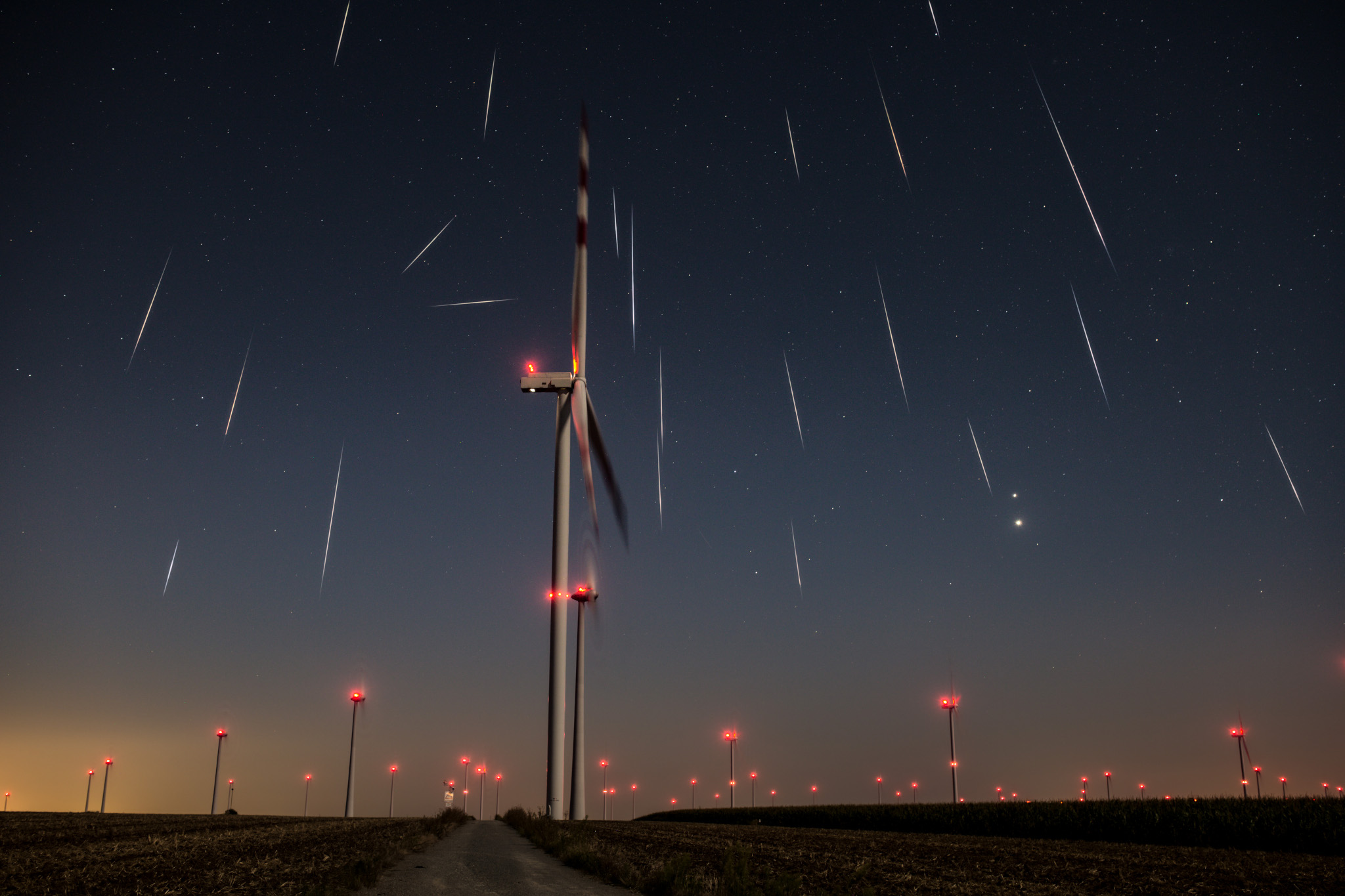 In this predawn skyscape recorded during the early morning hours of August 13, mostly Perseid meteors are raining down on planet Earth. You can easily identify the Perseid meteor streaks. They're the ones with trails that seem to converge on the annual meteor shower's radiant, a spot in the heroic constellation Perseus, located off the top of the frame. That's the direction in Earth's sky that looks along the orbit of this meteor shower's parent, periodic Comet Swift-Tuttle. Of course the scene is a composite, a combination of about 500 digital exposures to capture meteors registered with a single base frame exposure. But all exposures were taken during a period of around 2.5 hours from a wind farm near Mönchhof, Burgenland, Austria. Red lights on the individual wind turbine towers dot the foreground. In their spectacular close conjunction, bright planets Jupiter and Venus are poised above the eastern horizon.