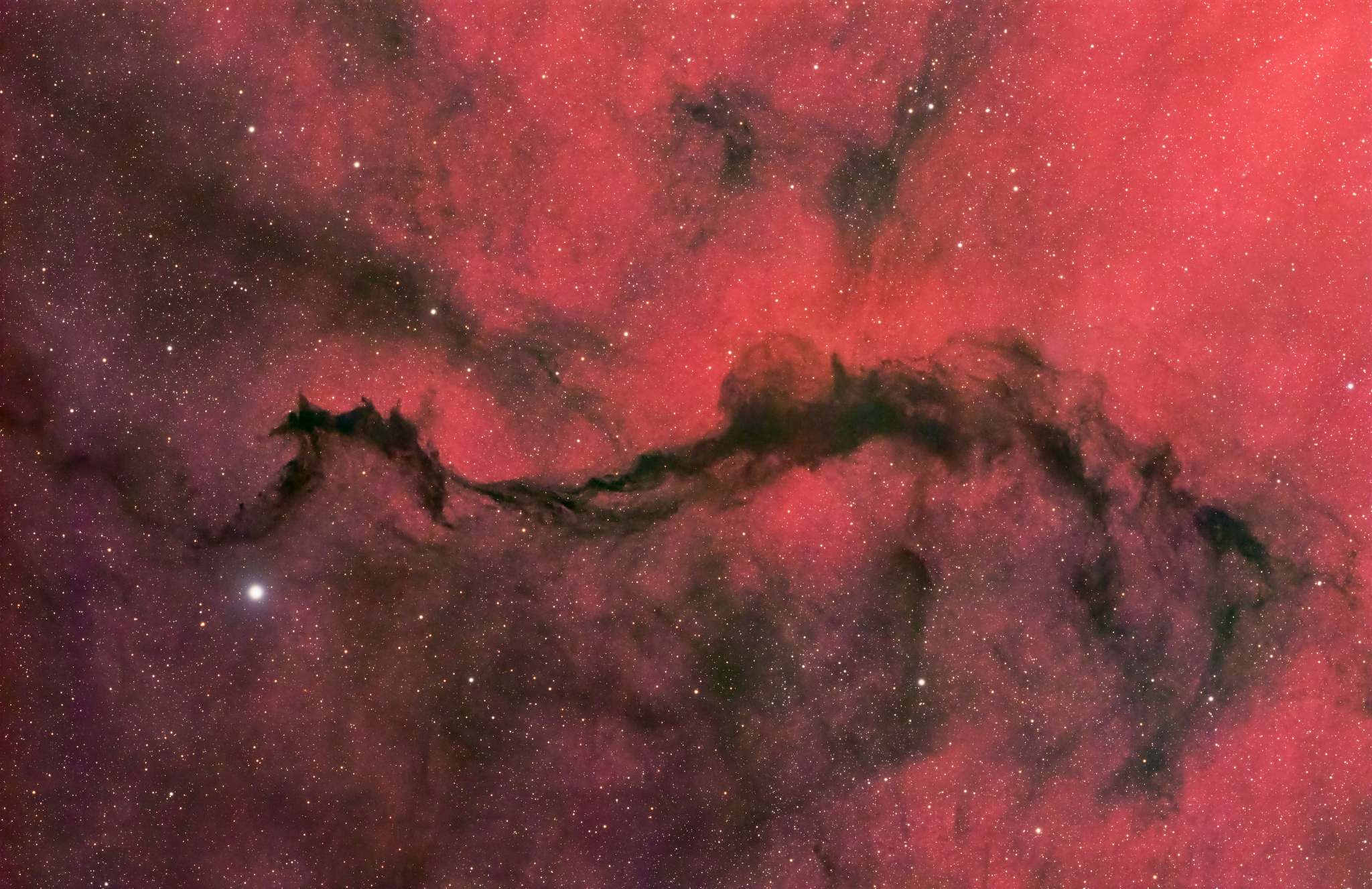 The diffuse hydrogen-alpha glow of emission region Sh2-27 fills this cosmic scene. The field of view spans nearly 3 degrees across the nebula-rich constellation Ophiuchus toward the central Milky Way. A Dark Veil of wispy interstellar dust clouds draped across the foreground is chiefly identified as LDN 234 and LDN 204 from the 1962 Catalog of Dark Nebulae by American astronomer Beverly Lynds. Sh2-27 itself is the large but faint HII region surrounding runaway O-type star Zeta Ophiuchi. Along with the Zeta Oph HII region, LDN 234 and LDN 204 are likely 500 or so light-years away. At that distance, this telescopic frame would be about 25 light-years wide.