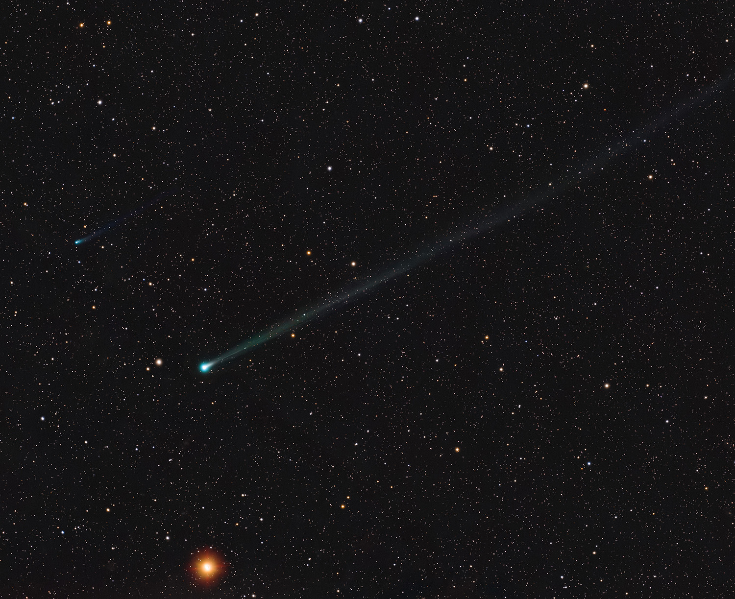 A new visitor to the inner Solar System, comet C/2025 R2 (SWAN) sports a long ion tail extending diagonally across this almost 7 degree wide telescopic field of view recorded on September 21. A fainter fellow comet also making its inner Solar System debut, C/2025 K1 (ATLAS), can be spotted above and left of SWAN's greenish coma, just visible against the background sea of stars in the constellation Virgo. Both new comets were only discovered in 2025 and are joined in this celestial frame by ruddy planet Mars (bottom), a more familiar wanderer in planet Earth's night skies. The comets may appear to be in a race, nearly neck and neck in their voyage through the inner Solar System and around the Sun. But this comet SWAN has already reached its perihelion or closest approach to the Sun on September 12 and is now outbound along its orbit. This comet ATLAS is still inbound though, and will make its perihelion passage on October 8.